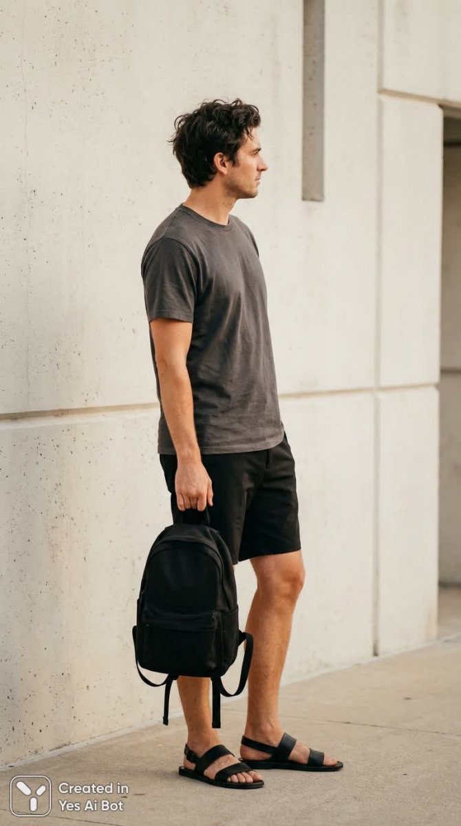 professional photo, nikon z7, 85mm f/1.4 lens, side profile, mid-shot, male in charcoal gray short-sleeve sweater, tailored black shorts, minimalist black sandals, holding a small black backpack, casual stance against textured monochrome background, tousled hair, warm lighting, photorealistic, clean lines, minimalism.