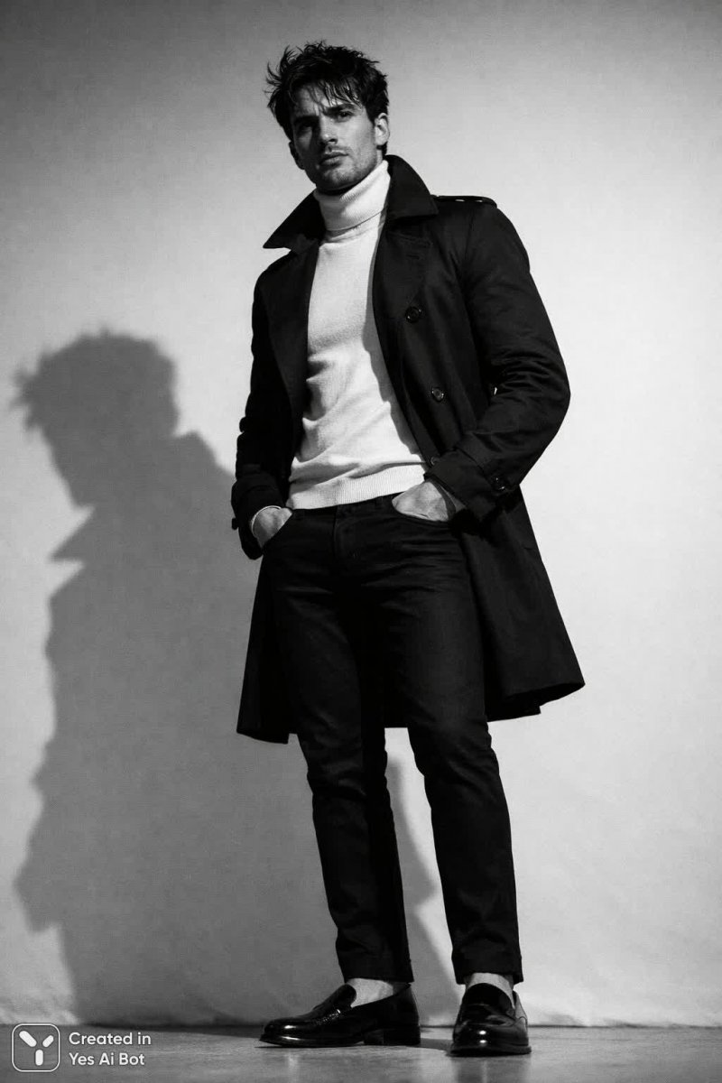 Изображение представляет собой стильный черно-белый портрет мужчины в классическом образе, выполненный с высокой детализацией и профессионализмом. Мужчина запечатлен на Nikon Z7 с объективом 85mm f/1.4 под низким углом, что придает ему монументальность. Он одет в черный тренчкот поверх белой водолазки, черные джинсы и лоферы. Руки сложены в карманах, волосы слегка растрепаны, создавая непринужденный вид. Нейтральное освещение и четкие тени подчеркивают черты лица, а монохромная палитра усиливает ощущение классической элегантности и минимализма. Композиция сфокусирована на ключевых деталях образа, обеспечивая гармоничное визуальное впечатление высокого качества. Фотография выполнена нейронной сетью Sora Images в стилях Fashion и Luxury, демонстрируя внимание к деталям и профессиональный подход. Изображение создано по промту, описывающему технические характеристики съемки и элементы одежды, что подчеркивает точность исполнения.