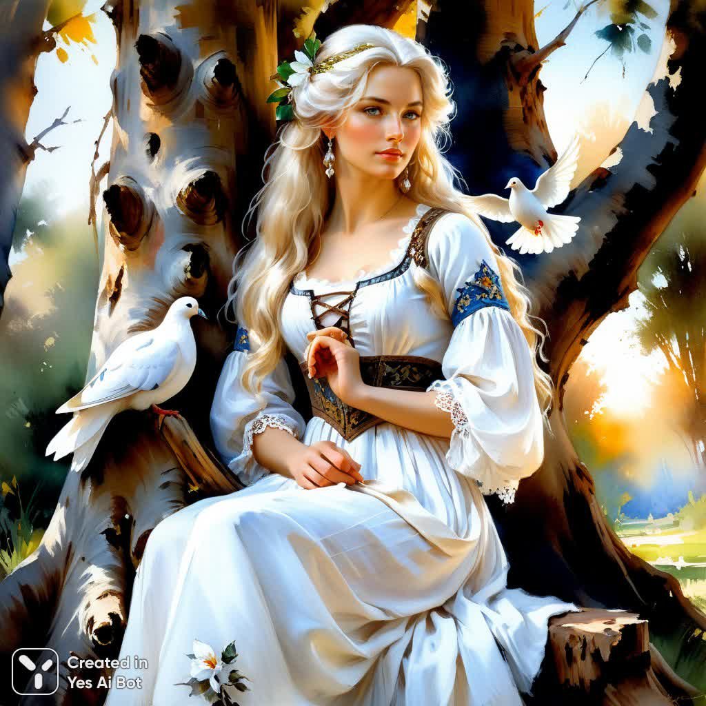 Изящная женщина с длинными светлыми волосами запечатлена в винтажном деревенском наряде, стоя у могучего дерева. Композиция выполнена в трехчетвертном ракурсе, демонстрируя полный рост модели. На ее плече нежно примостилась маленькая белая голубка, добавляя образу особую грацию и символизм. Художественный стиль напоминает работы Михаила Гармаша, с его характерной любовью к деталям и мягким цветовым решениям. Использование техник масляной живописи и акварели, а также плавные переходы, созданные благодаря аэрографии, придают картине воздушность и нежность. Вся работа пронизана атмосферой умиротворения и спокойствия, передавая ощущение близости к природе и гармонии с окружающим миром. Детализированный рисунок волос, текстура ткани одежды и реалистичное изображение перьев голубя свидетельствуют о мастерстве художника и его внимании к мельчайшим нюансам. Картина словно переносит зрителя в прошлое, позволяя ощутить дух старинной эпохи и насладиться красотой момента запечатленного на холсте. Это произведение искусства вызывает чувство тепла, уюта и ностальгии. Светлые тона создают атмосферу легкости и чистоты, а мягкие линии придают образу женственности и хрупкости. Вся композиция гармонично сочетается друг с другом, формируя единое целое, которое завораживает своей красотой и утонченностью