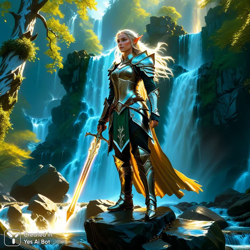 Elven warrior in shining mythril armor, standing atop a waterfall in an ancient forest, hair waving in the wind, magic runes glowing on weapons, epic fantasy art, digital painting, highly detailed, 8k, in the style of Greg Rutkowski and Art