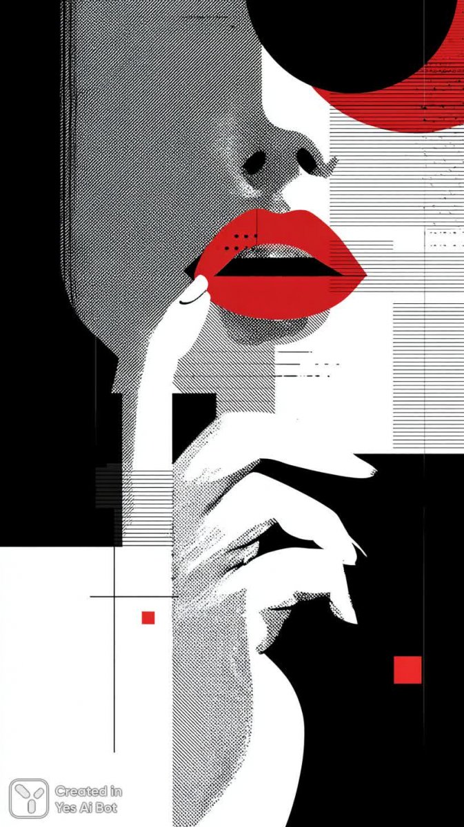 Изящный черно-белый портрет женщины, воплощающий минимализм и элегантность. Выражение лица загадочно раскрыто в удивлении или восхищении, а смело нанесенная ярко-красная помада создает эффектный контраст с монохромной палитрой. Рука нежно покоится на подбородке, добавляя портрету нотку задумчивости и внутренней силы. Фон из горизонтальных линий подчеркивает геометрию композиции и усиливает ощущение простора и чистоты. Плоские формы гармонично сочетаются друг с другом, формируя лаконичное, но запоминающееся изображение. Это не просто портрет – это исследование красоты в ее самых чистых формах, игра света и тени, где акцент сделан на деталях и выразительности взгляда. Изображение излучает уверенность и стиль, демонстрируя мастерство художника в создании визуально привлекательного и концептуального произведения искусства. Оно идеально подходит для тех, кто ценит современное искусство и минималистичный дизайн, стремясь к простоте и элегантности в каждой детали. Это манифест сдержанности, где каждый элемент имеет значение, а общее впечатление – потрясающе сильное