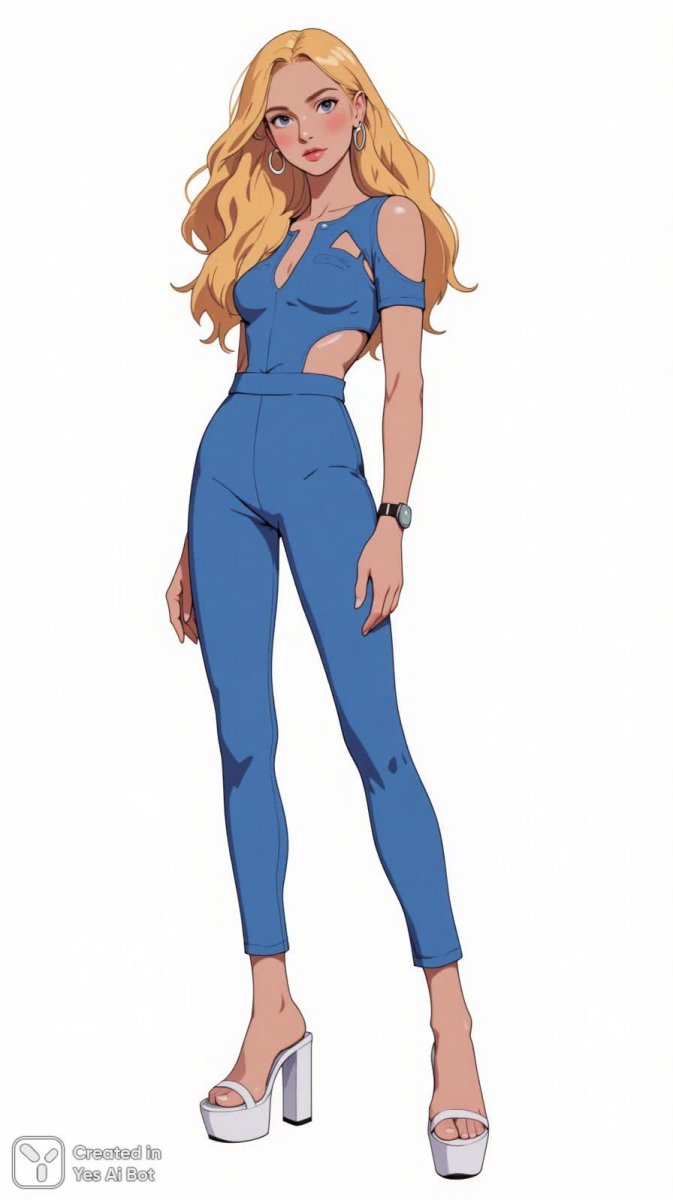 girl with long wavy hair, stylish blue jumpsuit with cutouts, fitted waist, chunky white platform heels, confident expression, minimal accessories, white BG, fashion editorial style illustration, bright studio lighting, full body perspective.