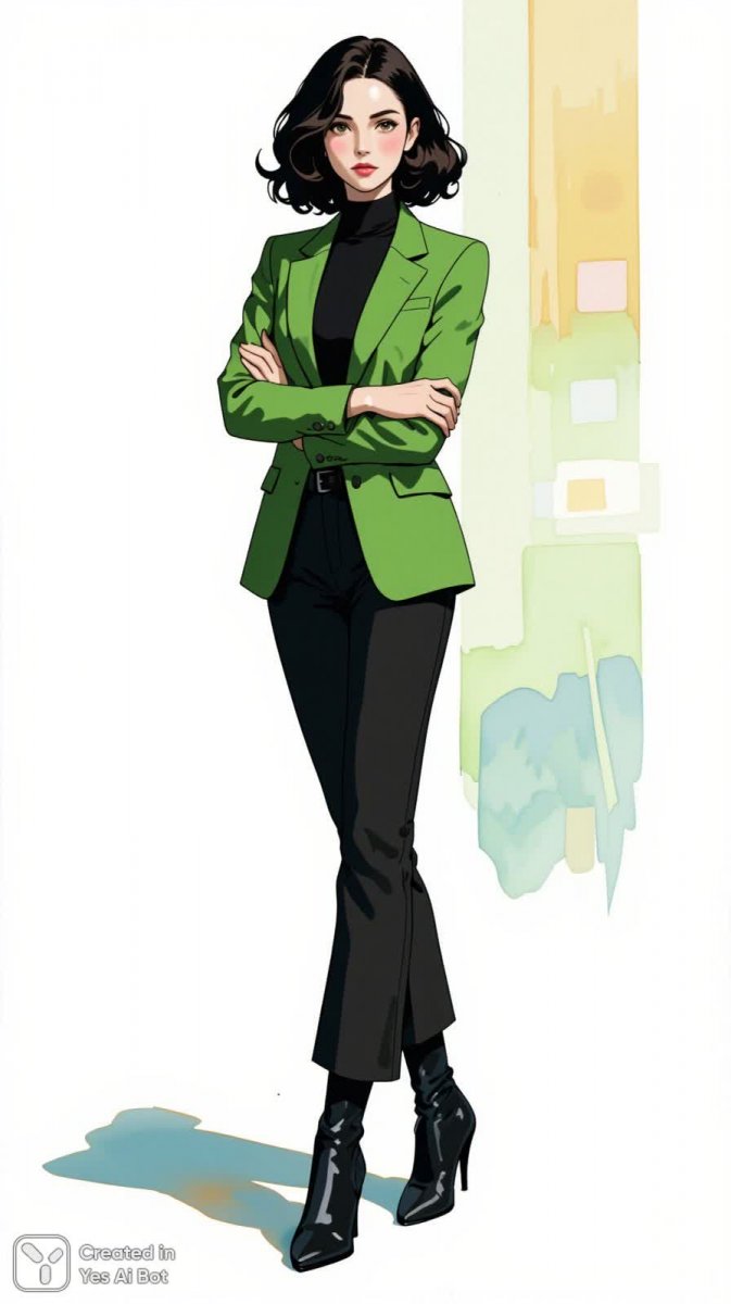 fashionable girl with dark wavy hair, wearing structured green blazer over fitted black turtleneck, tailored trousers, high-heeled boots, posing with arms crossed, bright background, editorial illustration style, light and shadow play.