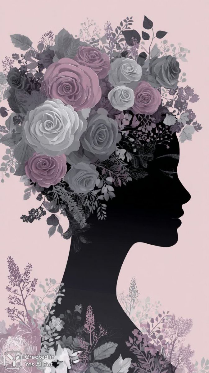 female silhouette in grayscale, decorated with floral wreath of roses and lavender, background pastel pink, macro shot, high quality illustration, delicate contrast details, airy mood.