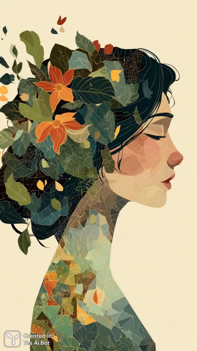 Изящный портрет юной девушки, излучающий спокойствие и умиротворение. Ее лицо выражает безмятежность, а густые темные волосы, словно водопад, обрамляют нежный образ, искусно украшенный яркими цветами и сочными зелеными листьями. Фон выполнен в мягких оттенках светло-лилового, создавая ощущение воздушности и легкости, подчеркивающее естественную красоту модели. Стиль изображения тяготеет к художественному реализму с акцентом на натуральность и мягкость фокусировки, что придает портрету особую глубину и живость. Ощущается деликатное присутствие природы в композиции, гармонично сочетающееся с плавными линиями и нежной палитрой цветов. Взгляд девушки полон задумчивости и внутренней силы, а цветочные мотивы добавляют образу романтичности и очарования. Это произведение искусства воплощает собой красоту молодости, связь с природой и спокойствие души, приглашая зрителя заглянуть в мир грез и мечтаний. Использование светлых тонов фона позволяет выделить изящные черты лица и прическу девушки, создавая эффект мягкого освещения и подчеркивая ее индивидуальность. Каждая деталь проработана с любовью к деталям, что делает этот портрет поистине незабываемым и запоминающимся произведением искусства. Портрет демонстрирует гармонию между красотой человеческого лица и великолепием природы, создавая ощущение внутреннего равновесия и умиротворения для зрителя