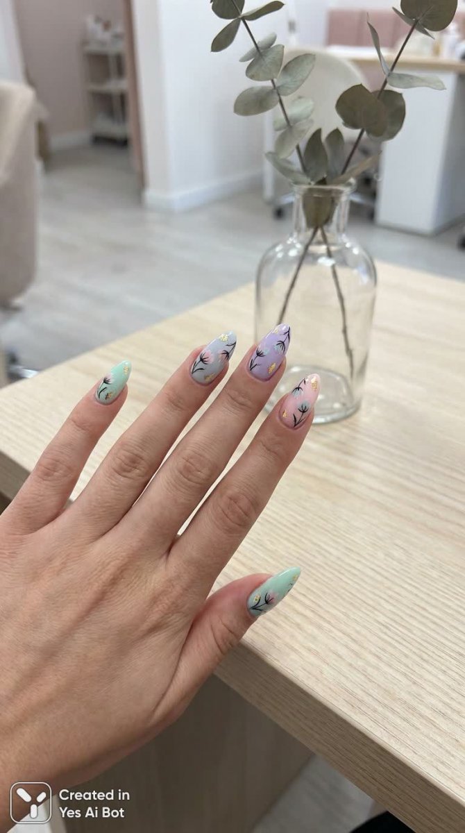 Изысканный дизайн гель-лака на длинных и элегантных ногтях воплощает собой нежность и утонченность. Продолговатые формы подчеркнуты глянцевым покрытием, создавая эффектный визуальный акцент. Пастельная цветовая гамма с мягкими оттенками мятной зелени, лаванды и пудрово-розового придает образу деликатность и воздушность. Тонкая ручная роспись украшает каждый ноготь изящными цветочными мотивами, обрамленными тонкими черными линиями и дополненными акцентами золота для усиления элегантности. Фоном служит минималистичная текстура светлого дерева, добавляющая теплу и уюту в общий образ. Мягкое рассеянное освещение подчеркивает блеск гель-лака и сложные детали маникюра. Композиция акцентирует внимание на ногтях на фоне нейтрального фона, имитирующего обстановку салона красоты, вызывая ощущение роскоши и изысканности. Такой дизайн идеально подходит для создания стильных фотографий в глянцевых изданиях о красоте и подчеркивает мастерство современного нейл-арта. Это настоящее произведение искусства на кончиках пальцев, сочетающее в себе нежность пастели, точность линий и блеск золотых акцентов. Идеальный выбор для тех, кто ценит изысканность и стремится к безупречному стилю