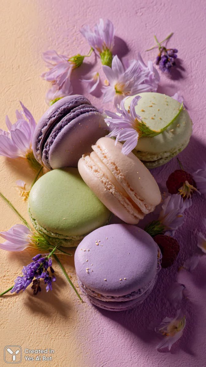 high-resolution food photography of colorful macaroons artistically arranged on a soft, pastel-colored backdrop, showcasing delicate textures and glossiness. The macaroons are in various shades like mint green, pale pink, lavender, and buttery yellow, with subtle variations in size and height to create visual interest. Soft diffused natural lighting illuminates the scene, casting gentle shadows and enhancing the airy aesthetic. Incorporate some delicate edible flowers and fresh fruits like raspberries for added contrast and a touch of elegance. The overall vibe is dreamy and inviting, perfect for a lifestyle or culinary blog.