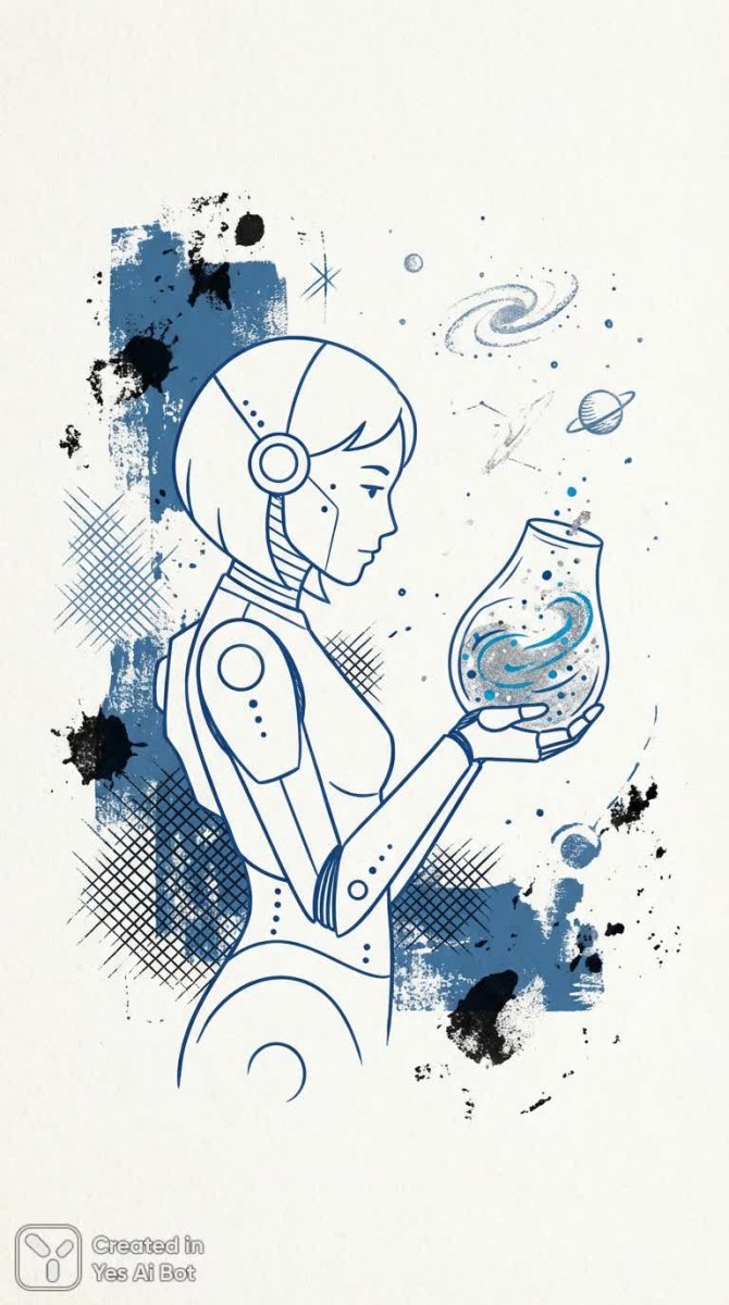 a blue ink illustration of a cyborg girl figure holding a glass vessel of liquid stardust, set against a grunge-inspired universe filled with galaxies and planets, incorporating elements of lowbrow art style.