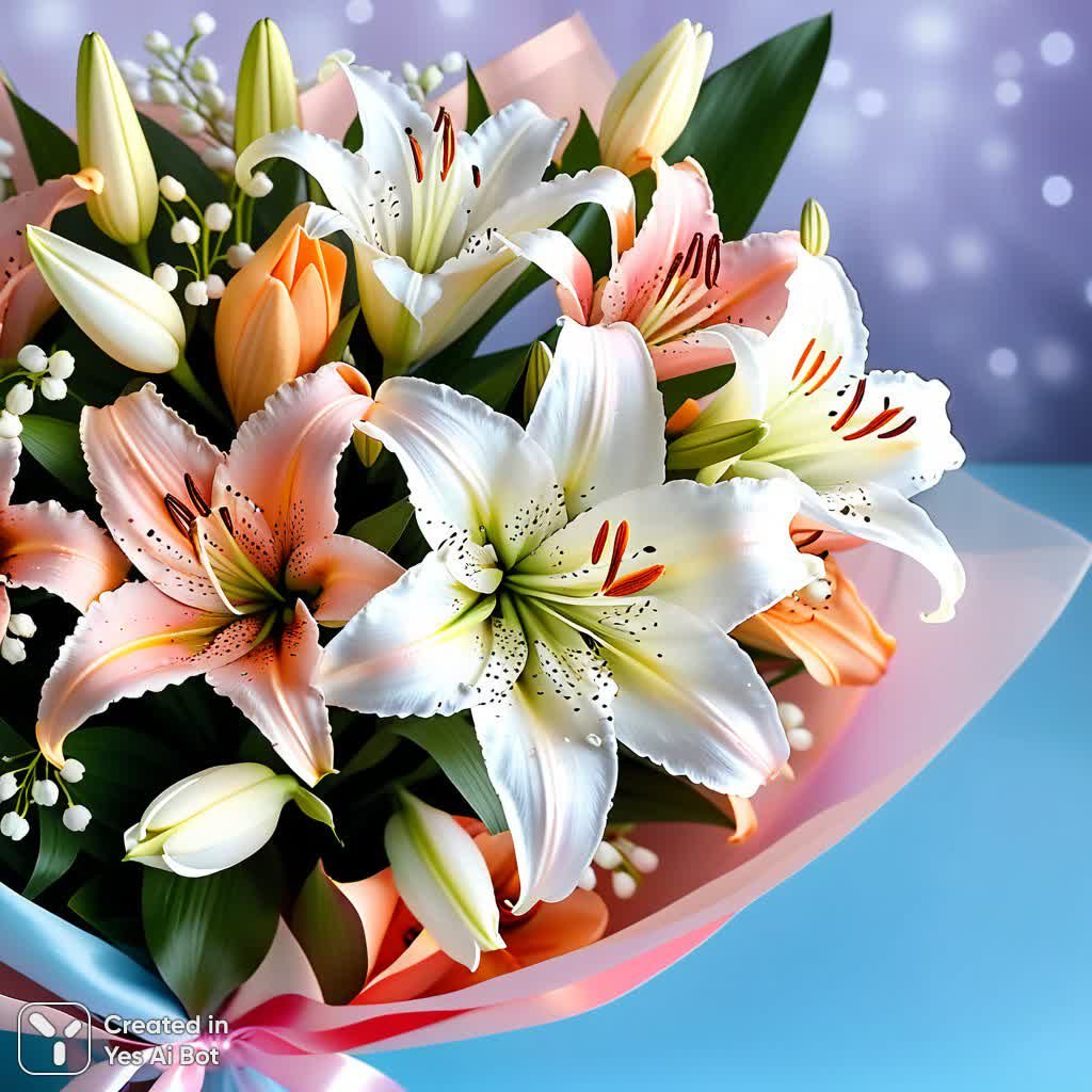 Изысканный букет лилий – воплощение нежности и элегантности. В центре композиции восхищает крупный белоснежный цветок с бархатистыми лепестками и ярко-желтым сердцевиной, украшенной длинными, тонкими тычинками. Вокруг него раскинулись прекрасные розовые лилии, каждый из которых уникален благодаря изящным пятнышкам на нежных лепестах. Букет дополнен деликатными колосками ландыша с миниатюрными белыми цветочками, словно хрустальные бусинки, добавляющими легкости и воздушности всей композиции. Стебли цветов аккуратно перевязаны широкой атласной лентой нежного персиково-розового оттенка, создающей гармоничное сочетание цветов и подчеркивающей роскошь букета. Задумчивый взгляд устремляется в пастельный фон, мягко размытый градиентом от лавандового до небесно-голубого, который навевает ощущение свежести зимнего воздуха и придает изображению загадочности. В воздухе кружат жемчужины разных размеров, словно капли росы на лепестках, а отдельные лепестки мягко парят, создавая иллюзию невесомости и волшебства. Мягкий, студийный свет подчеркивает красоту каждого цветка, раскрывая все нюансы текстуры и оттенков, позволяя зрителю насладиться великолепием этого неповторимого произведения искусства, наполненного утонченностью и изысканным вкусом. Это букет, который дарит ощущение тепла, комфорта и истинной красоты