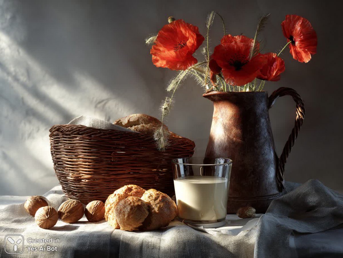 Coziness, silence, soft sunlight. A linen tablecloth with slight creases rests on a clay jug of milk. Nearby, a wicker basket with warm buns sprinkled with poppy seeds and a few cracked walnuts. A bouquet of wild daisies in a simple glass jar, through which the light beautifully refracts.