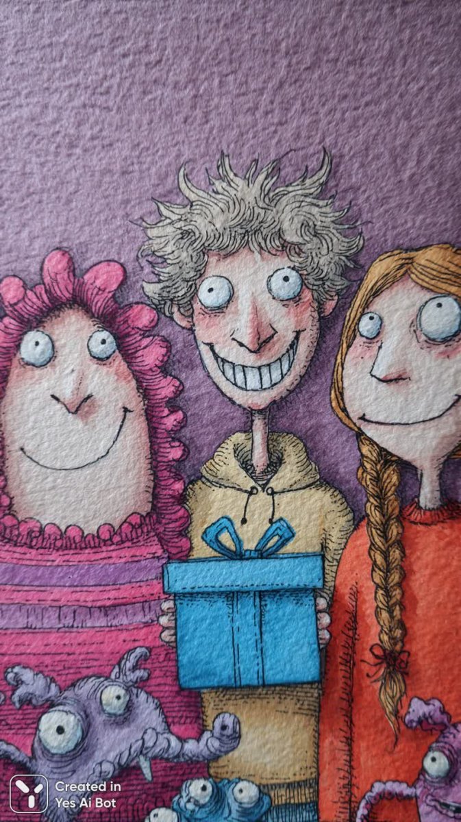 Необычный рисунок в технике наивного искусства сочетает элементы карикатуры и фольклорного декора. Иллюстрация, выполненная чернильными линиями с добавлением гуаши, изображает причудливую сцену с тремя фантастическими существами. Первый персонаж выделяется своей яркой внешностью: волнистые розово-фиолетовые волосы и озорная улыбка придают ему игривый характер. Второй – комичный герой в светлом фиолетовом худи, его растрепанные сине-белые волосы подчеркивают беззаботность и эксцентричность. Третий персонаж, обладающий большими выразительными глазами и косичками цвета красного, бережно держит в руках ярко-голубую коробку с подарком, стоя на фоне градиентной фиолетовой поверхности. Вся композиция пронизана духом фантазии и юмора, а нарочито гротескные черты придают изображению уникальность и неповторимость. Кажется, что персонажи сошли со страниц детской сказки или ожили на бумаге благодаря воображению талантливого художника. Изображение стилизовано под рисунок от руки, напоминающий зарисовки в альбоме или эскиз для мультфильма, с добавлением элементов дзен-тангла и народных мотивов. Общее впечатление – легкость, беззаботность и искреннее удовольствие от созерцания этого необычного мира. Это яркое и запоминающееся произведение искусства, которое вызывает улыбку и дарит хорошее настроение