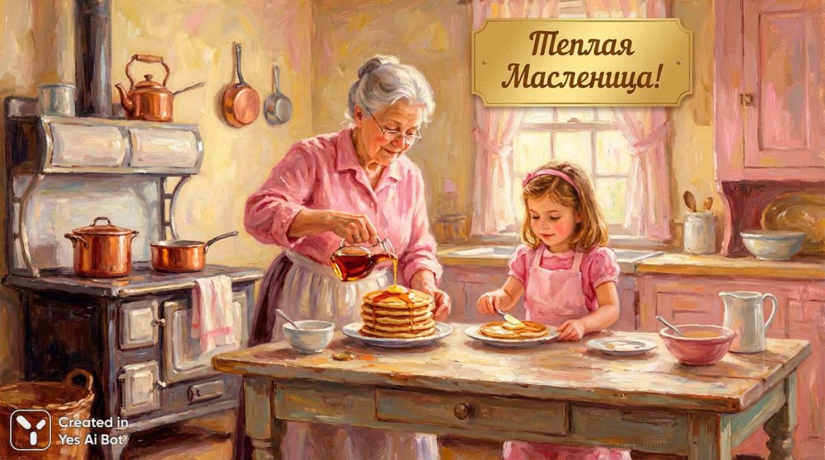 Уютная кухня наполнена теплом и ароматом свежеиспеченных блинов. В центре сцены – две женщины: пожилая дама в очках и розовой рубашке с любовью поливает стопку блинов душистым сиропом, а юная помощница, одетая в такой же фартук, аккуратно смазывает их растопленным маслом. Мягкий свет создает атмосферу домашнего уюта, подчеркивая рустикальный интерьер и ощущение тепла. Над головами висит золотая вывеска с надписью Теплая Масленица!, словно приглашая разделить радость этого традиционного праздника. Картина выполнена в импрессионистской манере, используя нежные желтые и розовые оттенки, которые усиливают общее впечатление тепла, спокойствия и семейного счастья. Здесь царит атмосфера любви и заботы, где поколения объединяются вокруг общего дела – приготовления вкуснейших блинов. Это момент искреннего общения и передачи опыта от старшего поколения к младшему. Чувствуется тепло домашнего очага и радость совместного времяпрепровождения, создавая неповторимую атмосферу праздника и уюта в самом сердце дома. Эта картина – воплощение семейных ценностей и традиций, передающихся из поколения в поколение