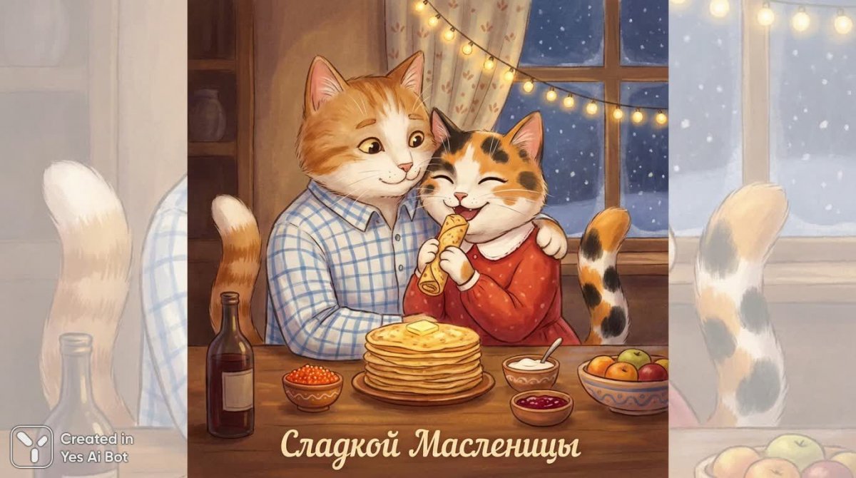 Трогательная иллюстрация, двух антропоморфных котов в уютной обстановке, празднующих Масленицу. Кот с ярко-оранжевой шерстью с белыми отметинами и слегка приоткрытой пастью нежно обнимает кошку. На нем сине-белая клетчатая рубашка, излучающая тепло. Кошка с пятнистой шерстью оранжевого, белого и черного цвета с удовольствием ест свернутый блинчик. Она одета в красное платье с белым ошейником. У них обоих похожие улыбающиеся черты лица. На переднем плане деревянный стол, заставленный традиционными угощениями Масленицы. Рядом с небольшими мисочками красной икры, сметаны и других деликатесов, миской фруктов и бутылкой вина лежит стопка золотистых блинчиков с кусочком масла. На заднем плане окно частично закрыто занавеской, а праздничное сияние гирлянд добавляет нотку торжества. Иллюстрация выполнена в мягкой, живописной манере с использованием теплых, располагающих цветов. Общее настроение праздничное и радостное, наполненное любовью и единством. Композиция сбалансированная и располагающая, передающая ощущение тепла, уюта и радости общего праздника, вызывающая чувство семейной любви и счастья. Внизу иллюстрации надпись "Сладкой Масленицы"