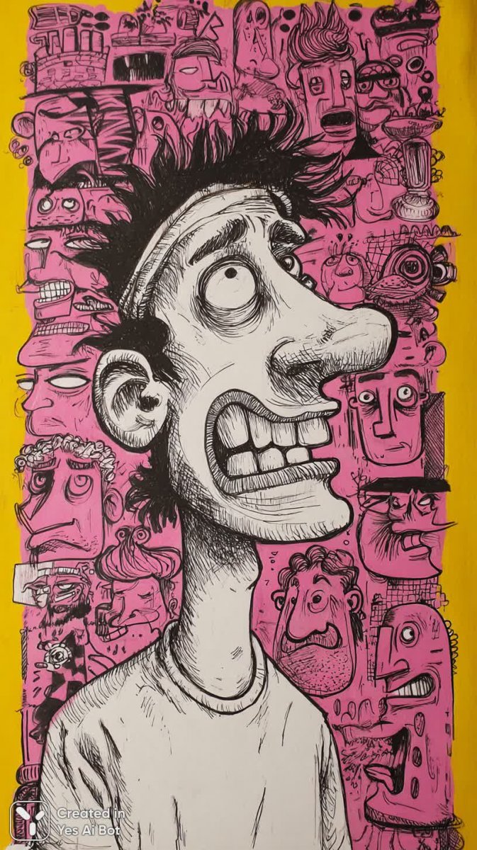 Яркая и хаотичная иллюстрация в духе наивного искусства, выполненная в технике коллажа с элементами рисовани карандашом и гуашью. Картина представляет собой причудливую смесь каракулей, зентангловых узоров и фольклорных мотивов, напоминающую детские зарисовки или вырезные аппликации из бумаги. В центре композиции – гротескные карикатуры на человеческие лица, написанные в мультяшной манере с преувеличенными чертами. Один персонаж, изображенный с широкой улыбкой и растрепанными волосами, одет в простую белую футболку. Его выражение лица одновременно комично и немного безумно. Другой – в игривой позе демонстрирует гипертрофированные черты лица на фоне ярко-желтого фона, создавая ощущение абсурдности и легкости. Вся работа пронизана духом спонтанности и непосредственности, характерными для наивного искусства. Примитивные выражения лиц персонажей подчеркивают их незатейливость и искренность. Цветовая палитра, состоящая из насыщенных розовых и оранжевых оттенков, добавляет изображению энергии и жизнерадостности. В целом, иллюстрация производит впечатление забавного и немного странного мира, населенного эксцентричными персонажами, где царят хаос и безграничная фантазия художника. Это произведение искусства способно вызвать улыбку и подарить зрителю ощущение радости и свободы от условностей. Изображение идеально подходит для оформления детских товаров или иллюстраций к сказкам, а также станет прекрасным украшением интерьера в стиле бохо или поп-арт