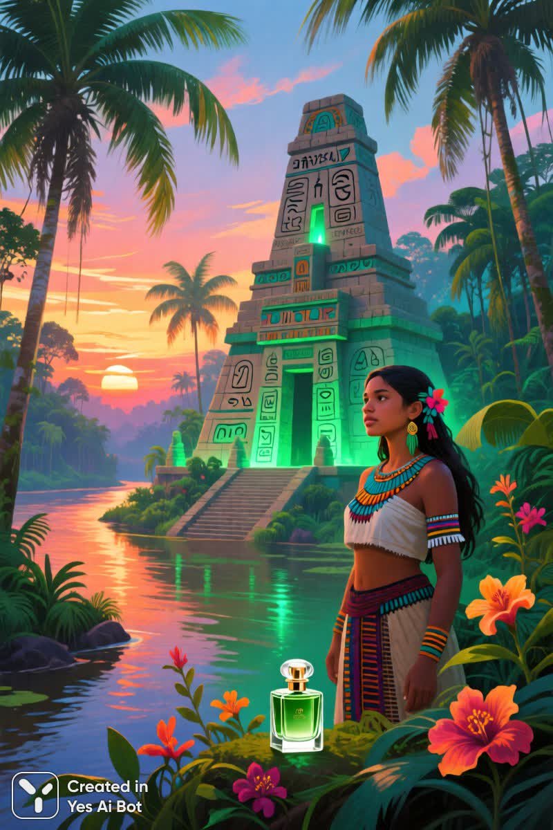 Future amazonian temple, emerald light, gentle breeze about palms, danger flowers, hieroglyphics, amazon daughter, linen amazonian traditional robes, perfume, gungle, civilizations, Amazon River, sunset art, professional acrylic painting, cgi, 1024k