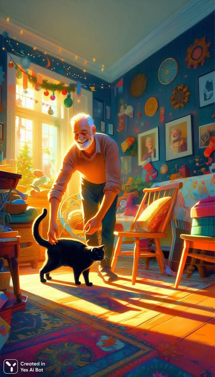 В атмосфере тепла и домашнего уюта, где царит безупречная чистота, разворачивается сцена предновогодней радости. Дедушка, в предвкушении праздника, создает вокруг себя атмосферу волшебства и безмятежности. Его внимание привлекает черный кот, верный спутник и любимец, который лениво выглядывает из-под стула. Ласковый вопрос деда, обращенный к своему 'усатому проказнику', наполняет комнату нежностью и теплом, словно приглашая кота разделить с ним радость наступающего торжества. Эта сцена – воплощение семейного счастья и гармонии, где каждый уголок дома дышит уютом, а любимый питомец становится неотъемлемой частью праздничного настроения. Простота бытового момента приобретает особую ценность благодаря искренней заботе дедушки о своем пушистом друге. Это не просто кот – это часть его семьи, источник радости и душевного тепла. В этой тихой и уютной обстановке ощущается предчувствие чего-то волшебного, что обязательно произойдет в новогоднюю ночь. Дедушка создает вокруг себя атмосферу праздника, чтобы разделить ее с близкими и любимым питомцем, наслаждаясь каждым мгновением этого особенного времени года. Кажется, будто время замедляется, позволяя насладиться моментом покоя и тепла в кругу самых дорогих людей и животных