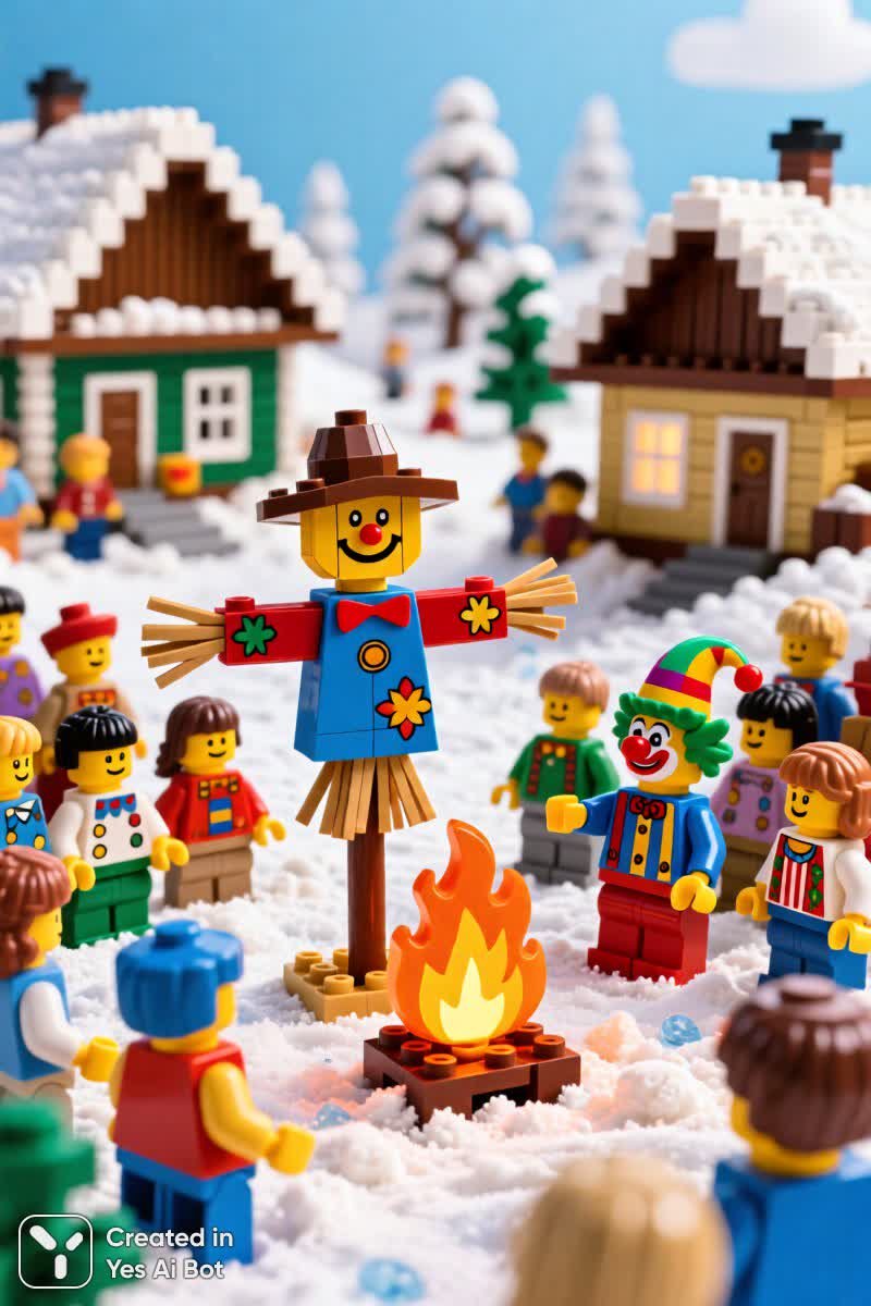 A scene depicting a Maslenitsa celebration in Lego style. A colorful scarecrow stands in the center, surrounded by a toy Lego fire, a crowd of people of different ages, a buffoon circling around the scarecrow, old one-story houses, and lots of snowdrifts all around. Every detail must be made in Lego style.