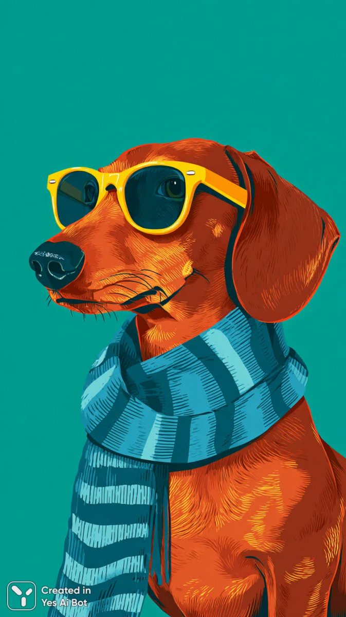 Изящный минималистичный портрет очаровательной таксы насыщенных коричневых тонов, выделяющийся на фоне сочного зеленого цвета. В центре внимания — яркие аксессуары, подчеркивающие современный стиль иллюстрации. На шее собаки красуется небесно-голубой шарфик, добавляющий образу свежести и легкости, а забавные желтые солнцезащитные очки придают питомцу игривый и непринужденный вид. Акцент сделан на деталях и гармоничном сочетании цветов, создавая яркое и запоминающееся изображение. Использование насыщенных оттенков придает работе динамичность и современность, а минималистичный подход позволяет сконцентрироваться на ключевых элементах композиции. Этот портрет – воплощение стиля и элегантности в современном исполнении, идеально подходящий для любителей оригинальных иллюстраций с акцентом на детали и яркие цвета. В целом это изображение излучает позитив, энергию и хорошее настроение, представляя собой стильный аксессуар для любого интерьера или цифрового пространства
