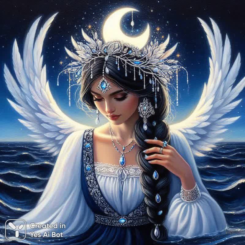 Acrylic painting, a beautiful dark-haired woman with a braid, a glowing crescent moon attached to the braid, a silver headdress adorned with precious stones on her head, and a glowing star-shaped stone in the middle of the headdress. She wears a dark blue sundress embroidered with silver, a white blouse with long sleeves, a necklace, earrings, and rings on her fingers. She emerges from the sea, and her white swan wings fall apart, scattered by the wind, as dusk falls.