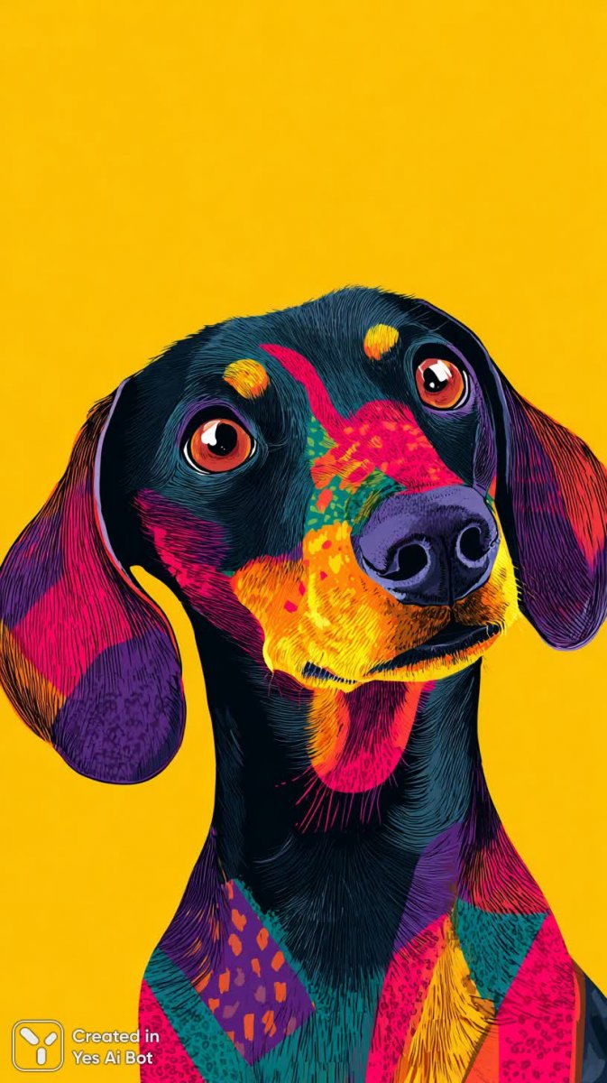 Черно-коричневый такса, облаченный в яркий розовый шарф, предстает перед нами в забавной мультяшной интерпретации. Крупный план фокусируется на его выразительной мордочке, где можно заметить игривое выражение глаз и слегка приподнятые уголки губ, словно он готов к новому приключению или озорному шалунию. Яркий желтый фон подчеркивает насыщенность цветов и создает ощущение тепла и позитива. Вся композиция выполнена в стиле поп-арт с использованием красочных узоров и геометрических элементов, что добавляет изображению динамичности и визуальной привлекательности. Стиль 'flat design' придает работе лаконичность и современность, делая акцент на чистых линиях и простых формах. Использование ярких цветов, особенно контрастного сочетания черного, розового и желтого, делает изображение запоминающимся и вызывает положительные эмоции. Этот образ излучает беззаботность, веселье и энергию, идеально подходя для иллюстраций, дизайна или просто для поднятия настроения. Он словно оживает на экране, приглашая зрителя присоединиться к его игривому миру