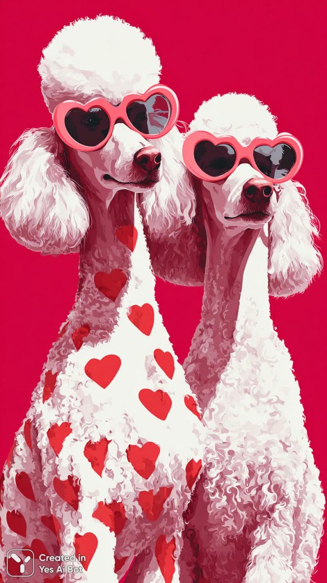 Две очаровательные пудели в ярком и жизнерадостном иллюстративном стиле. Один из питомцев демонстрирует элегантный образ: на нем надет красный свитер, украшенный милыми белыми сердечками, создающий атмосферу нежности и уюта. Второй пудель выделяется своим необычным аксессуаром – розовыми очками, которые придают его облику нотку игривости и модного шика. Оба питомца изображены в тесном объятии друг друга, что подчеркивает их дружбу и привязанность. Их лица излучают искреннюю радость и безмятежность, передавая позитивные эмоции зрителю. Фон выполнен в виде яркого цветочного узора, добавляющего композиции свежести и летнего настроения. Использование современного художественного стиля делает изображение стильным и актуальным, притягивая внимание своей оригинальностью. Сочетание насыщенных цветов и четких линий создает гармоничный визуальный эффект, делая эту иллюстрацию прекрасным украшением для любого проекта или пространства. Каждая деталь продумана до мелочей, чтобы передать характер и индивидуальность этих очаровательных пуделей, вызывая у зрителя теплые чувства и улыбку