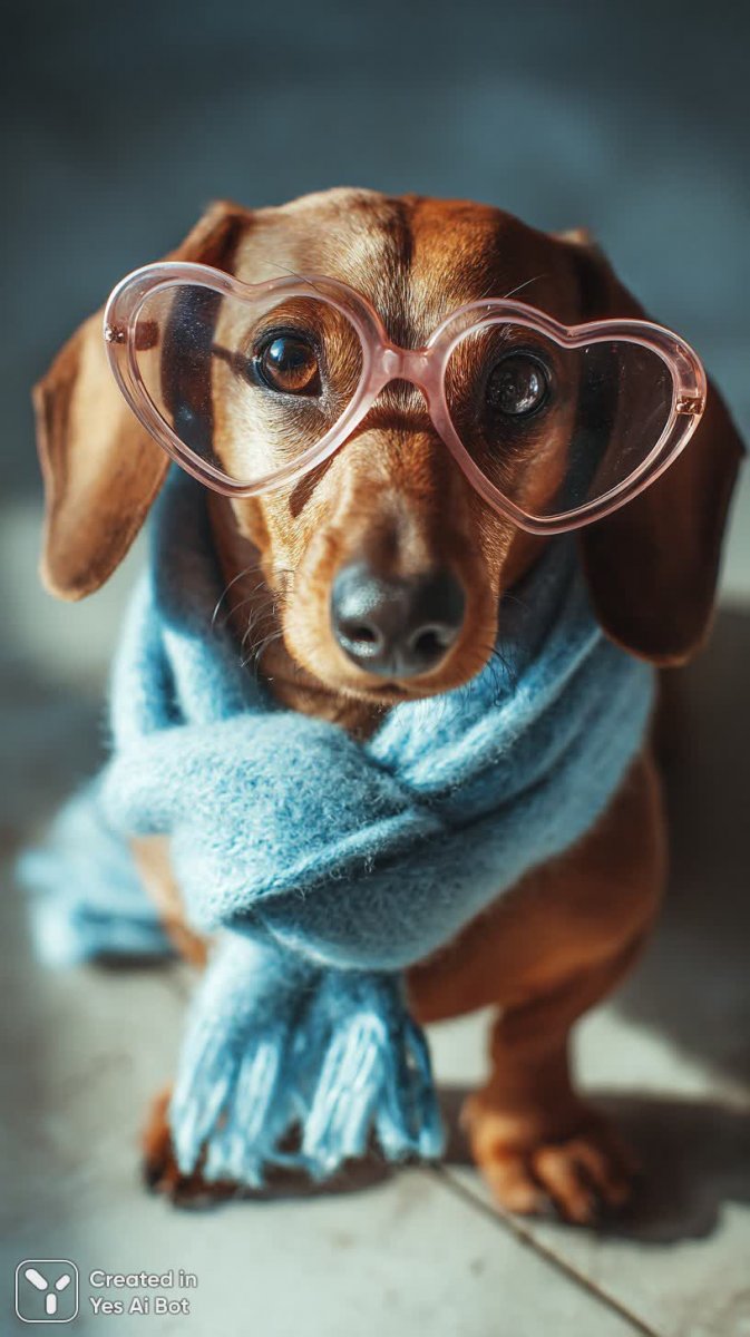 brown dachshund wearing pink heart-shaped glasses and blue scarf, sitting on bright tiled surface, minimalism, stylish portrait, soft lighting, contemporary art vibe, focus on expression.