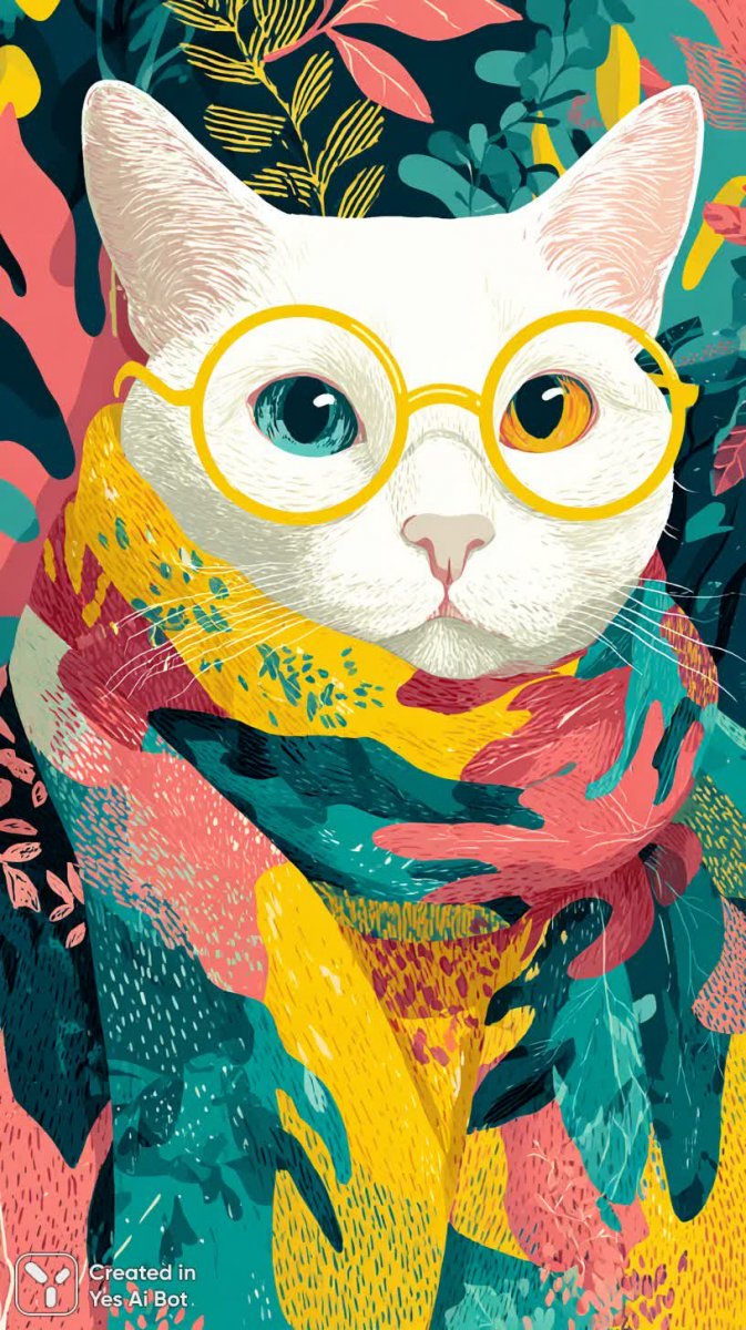 white cat with round glasses, wearing a colorful scarf, abstract floral patterns on BG, minimalism, vibrant colors, close-up portrait, stylish illustration.
