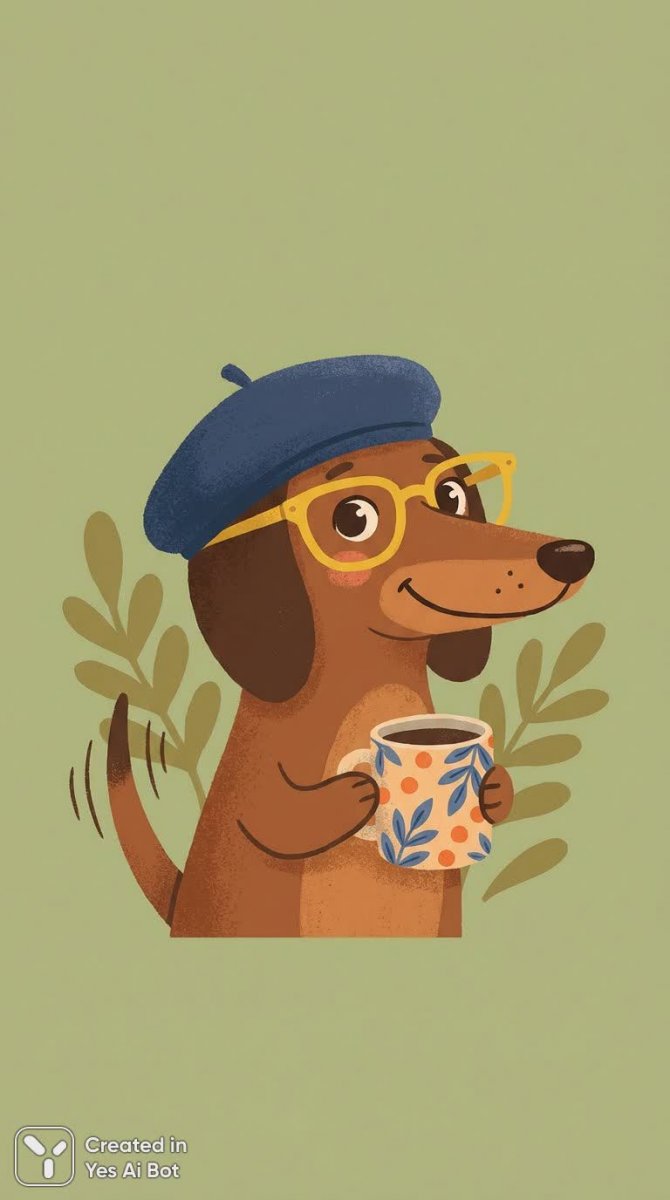Очаровательная иллюстрация жизнерадостной коричневой таксы, по-настоящему выделяющейся своим стильным внешним видом. На голове у неё – модная голубая берет, добавляющая образу игривости и шарма, а яркие жёлтые очки придают неповторимый колорит и делают её образ запоминающимся. В лапках такса аккуратно держит керамическую кружку с красочным узором, что создает ощущение уюта и тепла. Фон выполнен в минималистичном зелёном цвете, что позволяет полностью сосредоточиться на деталях и аксессуарах этой милой собаки. Особое внимание уделено тщательному проработке каждого элемента – от текстуры шерсти до мельчайших деталей берета и очков. Эта иллюстрация излучает позитив и хорошее настроение, являясь прекрасным примером яркого и детализированного цифрового искусства. Её можно использовать для различных целей: в качестве иллюстрации к статье, логотипа бренда или просто как украшение интерьера. В изображении прослеживается внимание к деталям и стремление передать характер персонажа, что делает его особенно привлекательным и запоминающимся. Такса выглядит очень мило и дружелюбно, вызывая улыбку у каждого зрителя. Это прекрасный пример того, как можно создать яркую и позитивную иллюстрацию с использованием простых элементов и акцентом на аксессуары. Иллюстрация выполнена в современном стиле и может понравиться широкой аудитории любителей животных и стильных вещей