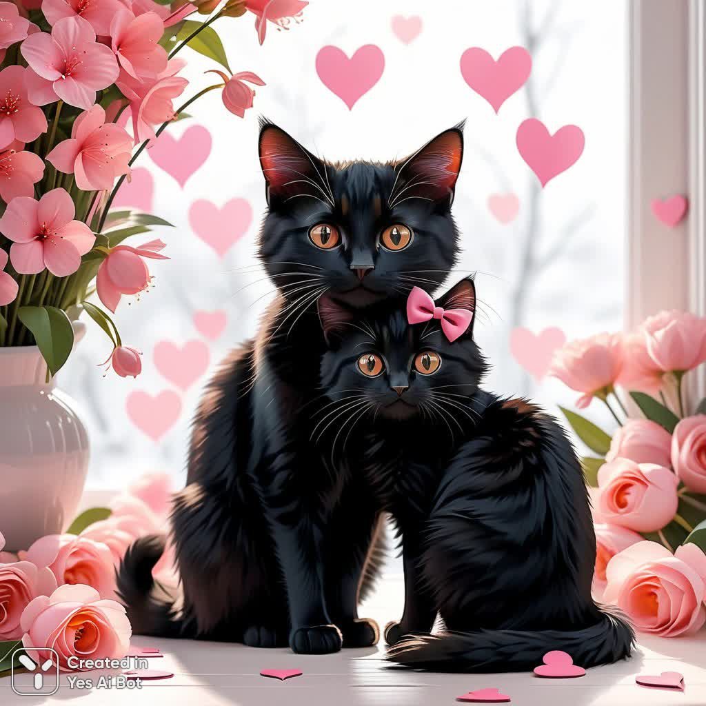 Нежная и трогательная иллюстрация, наполненная светом и добротой. На картине запечатлен момент прощения и всепоглощающей любви: рыжий и черный котенок слились в ласковых объятиях, создавая образ гармонии и примирения. Котики изображены с невероятной милотой – их большие выразительные глаза смотрят с любовью, длинные усы добавляют шарма, а пушистая шерсть выглядит очень приятной на ощупь. Ярким акцентом служат розовые сердца, расположенные на грудках котиков, символизирующие теплоту чувств и взаимную привязанность. Фоном для этой сцены служит чистый белый цвет, украшенный минималистичными розовыми цветочками, напоминающими о приближающейся весне и пробуждении природы. Вся картина пронизана атмосферой тепла и взаимопонимания, несмотря на холодный зимний свет, создавая ощущение уюта и спокойствия. Эта иллюстрация выглядит как идеальная открытка, способная подарить улыбку каждому, кто ее увидит, и напомнить о важности любви, прощения и принятия в любых жизненных ситуациях. Она излучает позитив, нежность и дарит ощущение душевного комфорта