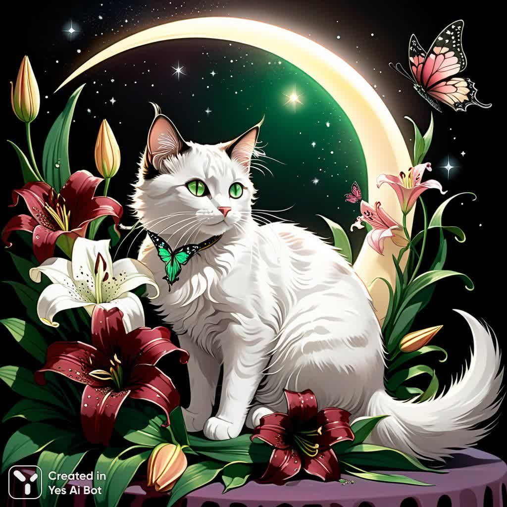 Лунный сад: кошка, лилии и бабочка в сказочном свете - Картинка, сгенерированная нейросетью Stable Diffusion