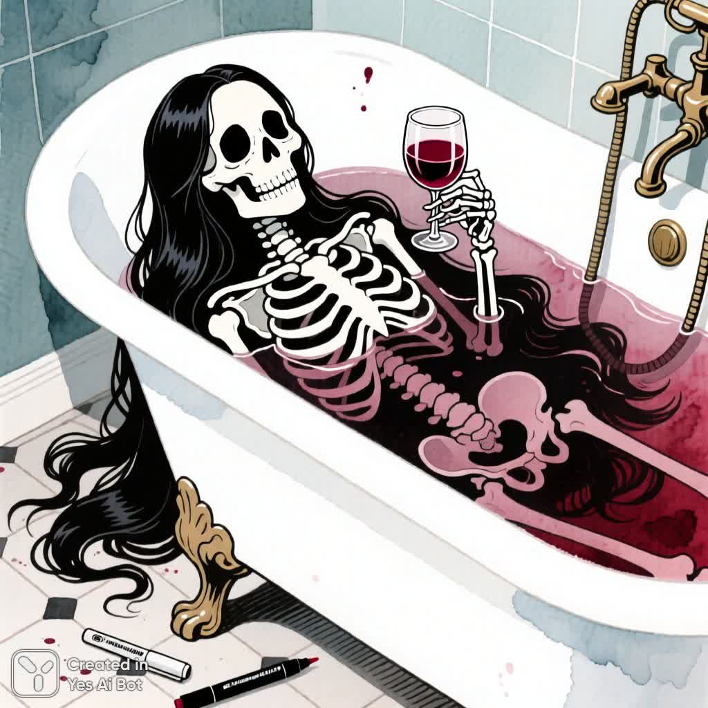 Right in the middle of the screen is a white bathtub, viewed from the floor. A skeleton with silky long black hair lies in the bathtub. In her bony hand she holds a glass of ruby wine and looks at the glass with empty eye sockets. Every detail is drawn. Nearby are many bathroom accessories. Watercolor technique with ink and alcohol ink outline using a marker to highlight the main object.