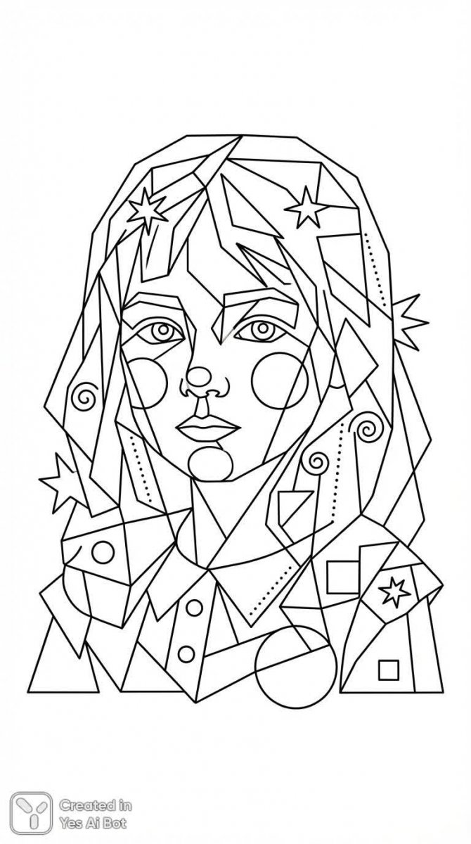 a cubist portrait of a girl, black and white line art, outline illustration, abstract shapes, geometric forms, for coloring page, playful elements, no color.