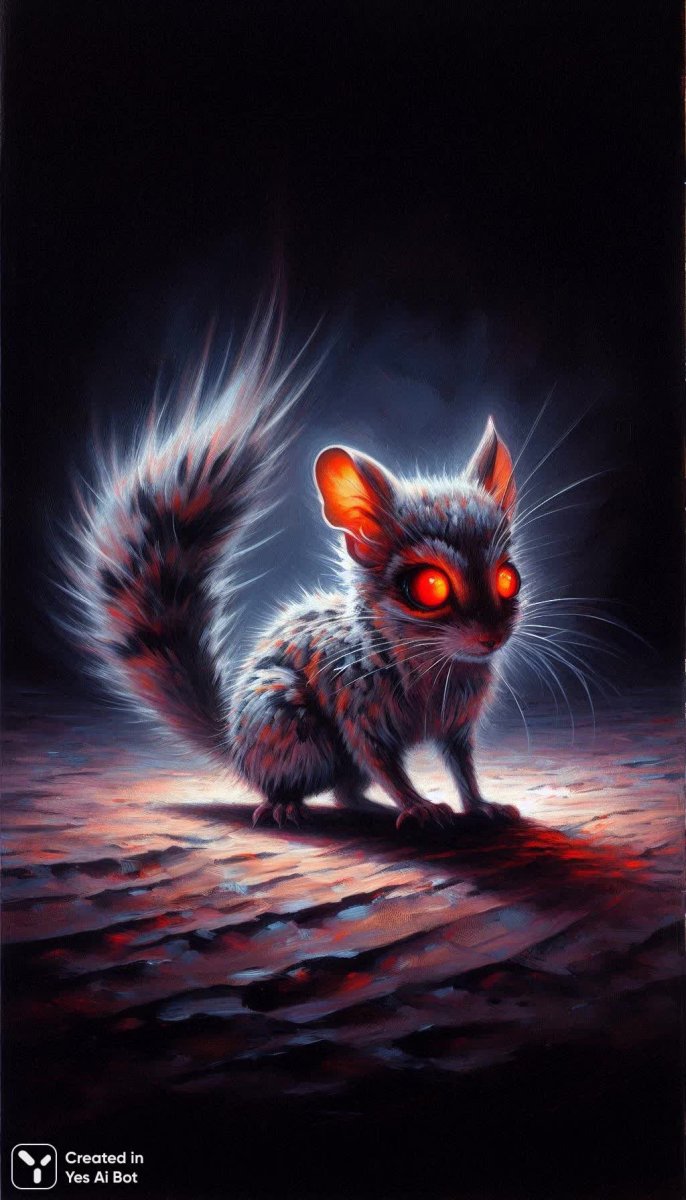 A menacing-looking sand jerboa with red eyes stumbled upon us in the silence of the night, he looks straight into our eyes without looking away, so that the prey does not escape from his small but tenacious clawed paws, this animal does not let go of its prey, fur stands on end, tail points in our direction, a dramatic and gloomy scene executed in acrylic paints in the style of the artist - Frances Tipton Hunter
