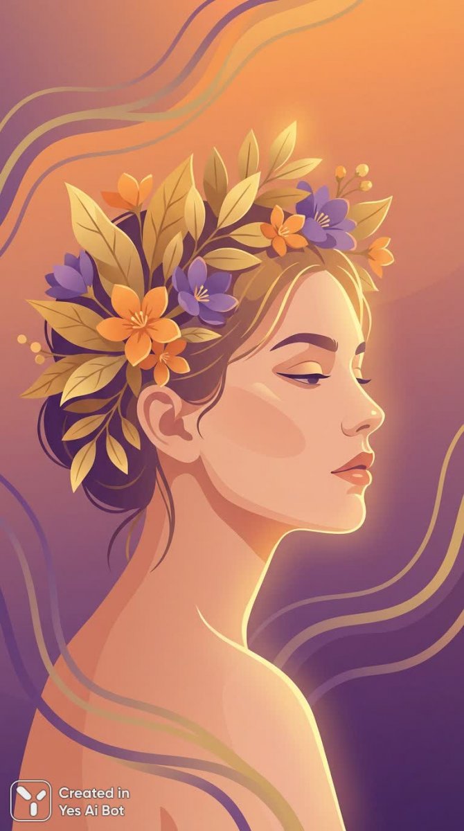 Завораживающий художественный портрет прекрасной женщины, обращенной вправо, пленяет своей загадочностью и неземной красотой. Ее полузакрытые глаза словно хранят глубокую тайну, а роскошная цветочная корона подчеркивает изысканность и утонченность образа. Яркий закатный градиент оранжевого и фиолетового цветов служит волшебным фоном для этой картины, а абстрактные волны придают изображению ощущение плавности и динамичности. Золотистый свет нежно освещает ее кожу, окутывая ее теплом и создавая атмосферу сказочного волшебства. Это произведение искусства переносит зрителя в мир грез и фантазий, где красота и грация сочетаются с мистической загадочностью. Кажется, будто перед нами богиня или фея, сошедшая с небес, чтобы подарить нам мгновение неземного очарования. Портрет излучает спокойствие и умиротворение, вызывая чувство восхищения и благоговения перед красотой природы и человеческого совершенства. Вся композиция пронизана гармонией и элегантностью, создавая неповторимый визуальный опыт. Это не просто портрет – это поэма, написанная красками и светом, посвященная вечной женственности и очарованию прекрасного