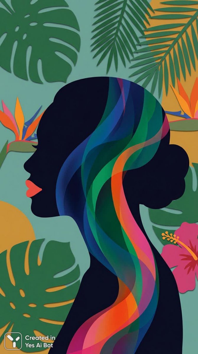 Изысканный цифровой коллаж представляет собой крупный план женского лица в профиль, захватывающий взгляд своей яркой красотой и сложной композицией. Вокруг силуэта женщины закручиваются вихри насыщенных, сочных цветов, создавая ощущение динамики и энергии, будто она сама является источником этого буйства красок. На заднем плане раскинулся пышный тропический лес с гигантскими листьями и экзотическими цветами, добавляя сцене атмосферу дикости и приключения. Губы женщины выделяются смелым коралловым оттенком, подчеркивая ее уверенность и страсть к жизни. Вся картина излучает дух свободы, бесстрашия и тяги к неизведанному. Гармоничное сочетание ярких цветов и экзотической природы создает ощущение единения человека с окружающим миром, демонстрируя силу и красоту женской натуры, сливающейся с энергией дикой природы. Это визуальная ода смелости, приключению и внутренней силе женщины, воплощенная в искусстве цифровой живописи. Каждое пятно цвета, каждая деталь пейзажа работают вместе, чтобы создать захватывающий образ, полный жизни и вдохновения