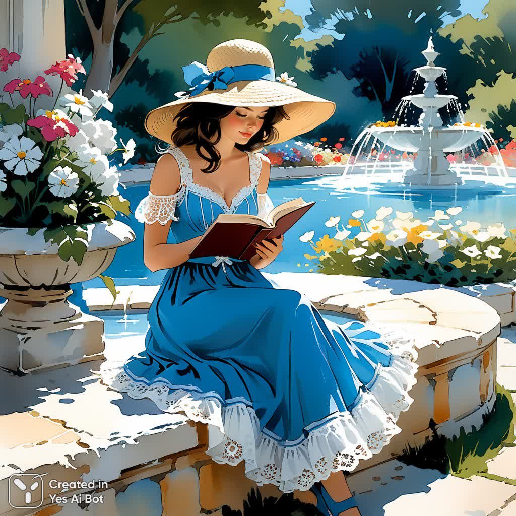 Изящный образ юной леди, застывший в моменте спокойствия и созерцания. Она удобно расположилась у прохладного фонтана, погруженная в чтение любимой книги. Нежный голубой кисейный наряд с деликатной отделкой из белого кружева подчеркивает ее хрупкую красоту и безмятежность. Соломенная шляпка добавляет легкости и очарования всей композиции, создавая ощущение летнего полуденного отдыха. Вдохновленная стилем знаменитых художников Гаррисона Фишера и Томаса Шаллера, эта картина передает атмосферу элегантности и романтики эпохи модерн. Виртуозное владение цветом и светом позволяет зрителю ощутить мягкое прикосновение солнечных лучей и прохладу фонтана. Лицо девушки слегка освещено, что придает ей задумчивый и мечтательный вид. Каждый элемент – от изящной шляпки до нежного кружева на платье – тщательно продуман для создания идеального образа утонченности и грации. Это настоящее воплощение женственности и красоты, запечатленное в вечном искусстве живописи. Картина излучает спокойствие и гармонию, приглашая зрителя окунуться в мир грез и романтических фантазий. Чувствуется легкий бриз, колышущий подол платья, создавая эффект движения и жизни. Композиция проста, но безупречна, а детализированная проработка позволяет рассмотреть мельчайшие нюансы образа. Это не просто портрет девушки с книгой – это история о любви к чтению, красоте природы и вечной женской грации