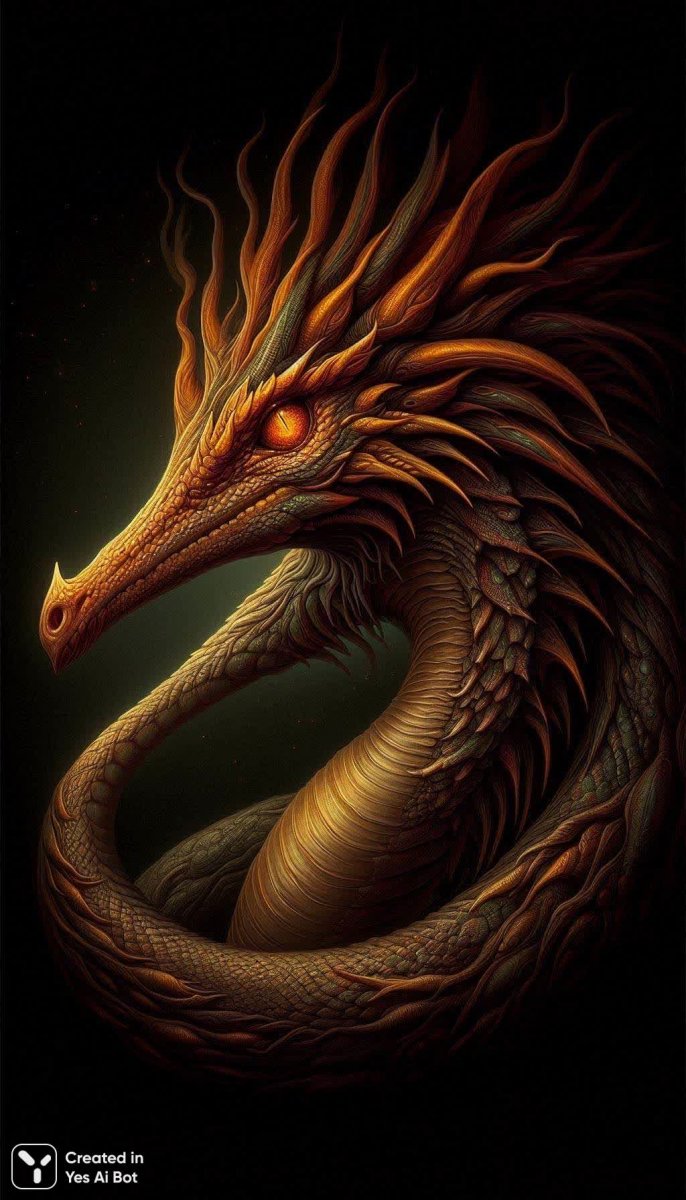 Its head is reptilian but elegant, with a long, slender snout ending in a small, sensitive nose. Two large, intelligent eyes dominate its face - they are a startling shade of molten gold, flecked with crimson. A crown-like crest of smaller, sharper feathers adorns its head, radiating outwards like a fiery halo. Its body is muscular and serpentine, coiling gracefully around a massive, ancient tree root. The Alaz Gruzul resides within the "Whispering Grotto," a hidden cavern deep within the heart of the Emerald Mire. The grotto is illuminated by bioluminescent fungi clinging to the damp walls – glowing in shades of turquoise and jade green. Water trickles down moss-covered rocks, creating small pools reflecting the fungal light. Thick, twisting vines draped with luminous orchids hang from the ceiling. The air is heavy with humidity and a faint scent of ozone and blooming flowers. A dense fog clings to the lower levels of the grotto, partially obscuring the ground.