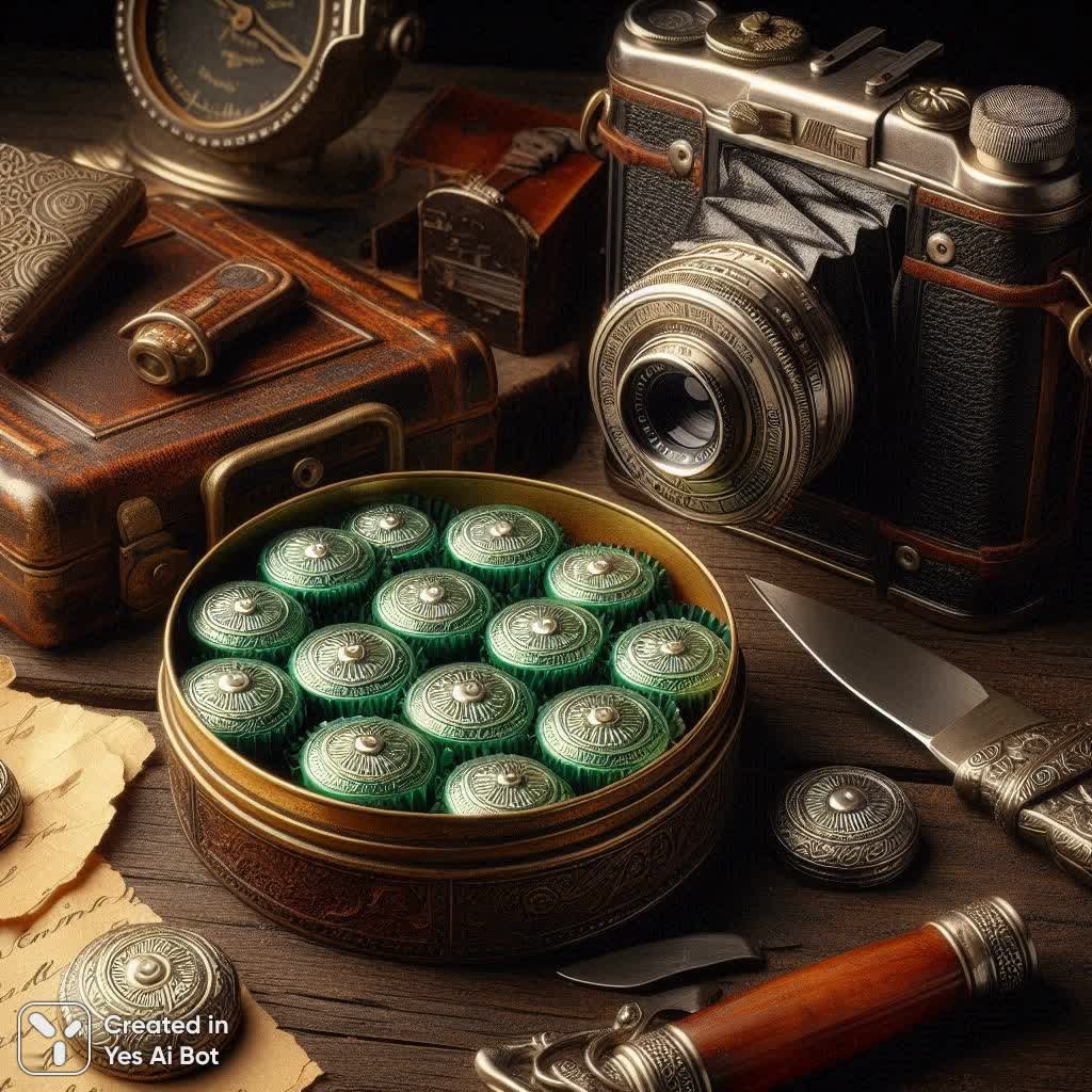 Атмосфера старины и творческого беспорядка запечатлена в этом визуальном этюде. На столе царит хаос вдохновения: раскрытая жестяная шкатулка, наполненная освежающими мятными конфетами в ярких зеленых обертках, словно приветствует свежестью задумчивость автора. Рядом покоится винтажный фотоаппарат девятнадцатого века – свидетель минувших эпох и запечатлевшихся моментов. Острый нож, разбросанные листы бумаги и изящный письменный прибор с чернильницей намекают на работу над важным проектом, возможно, написание письма или создание рисунка. В центре композиции, словно сокровище, лежит старинное серебряное женское кольцо – символ любви, верности или просто элегантной красоты. Этот натюрморт передает ощущение времени, остановившегося в моменте творчества и размышлений, где прошлое переплетается с настоящим в гармоничном беспорядке. Каждый предмет несет в себе историю, а вместе они создают завораживающую картину утонченной старины и вдохновенной работы. Чувствуется присутствие человека, погруженного в свои мысли, окруженного предметами, которые словно рассказывают свои собственные истории, создавая неповторимый колорит атмосферы мастерской или кабинета творца