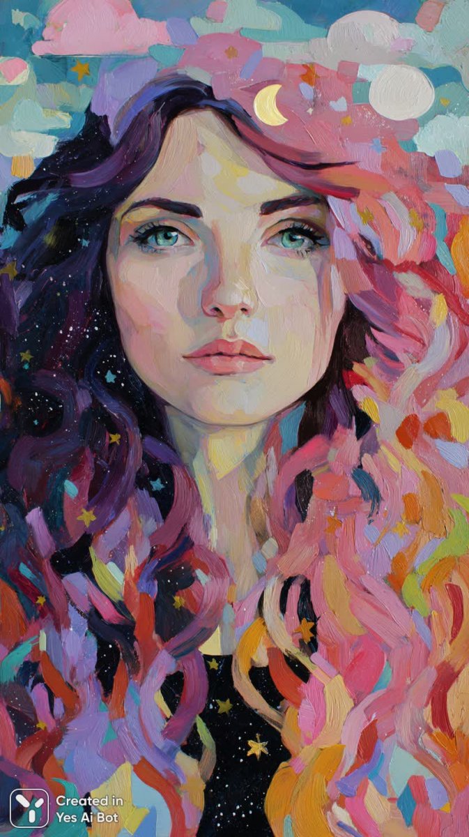 Завораживающий сюрреалистический портрет женщины, чьи волосы словно водопад переливающихся всеми цветами радуги, создают ощущение волшебства и неземной красоты. Ее широко раскрытые глаза отражают безграничный интерес к окружающему миру, а лицо обрамлено мягким сиянием пастельных тонов и хаотично расположенных фрагментированных форм. В пространстве вокруг головы героини разбросаны абстрактные звезды и луна, добавляющие картине загадочности и глубины. Эффектный, смелый стиль исполнения передает атмосферу творчества, вдохновения и детской непосредственности. Картина пропитана игривым настроением и воображением, приглашая зрителя окунуться в мир грез и фантазий, где реальность переплетается с вымыслом, а обыденное становится необыкновенным. Это визуальное воплощение мечтательности и бесконечных возможностей человеческого разума, способное вызвать поток ассоциаций и эмоций, пробуждая воображение и даря ощущение удивления перед красотой непредсказуемого мира. Портрет излучает энергию позитива и оптимизма, словно приглашая к новым открытиям и творческим свершениям. Каждое цветовое решение и форма создают гармоничный ансамбль, подчеркивая индивидуальность и неповторимость образа