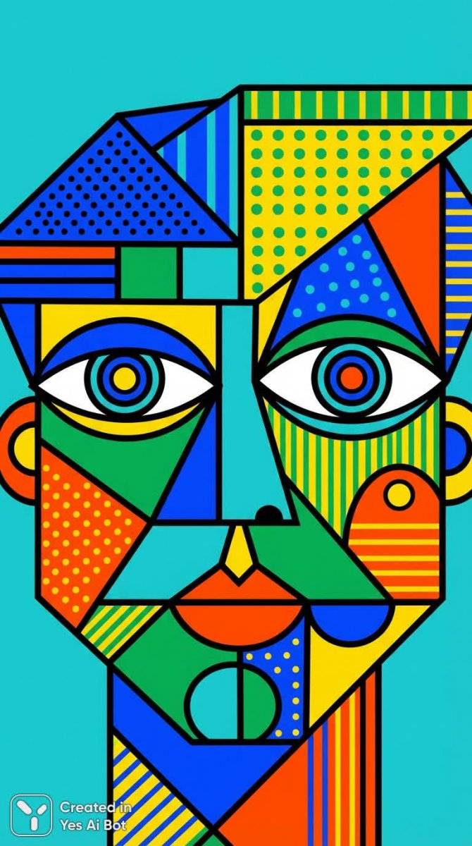 Яркий геометрический портрет, демонстрирующий близкий план лица, выполненный в стилистике минимализма и современной художественной экспрессии. Картина выделяется смелыми цветовыми секциями, создающими визуальный контраст и динамику. В центре композиции – стилизованные большие глаза, привлекающие внимание и придающие изображению выразительность. Четкие, толстые черные линии подчеркивают геометрические формы и добавляют графичности всему образу. Использование контрастных узоров создает ощущение глубины и сложности, несмотря на общую простоту стиля. Фон выполнен в плоском ярком цвете, обеспечивая чистоту и акцентируя внимание на деталях портрета. В целом работа представляет собой современное художественное произведение, сочетающее в себе абстракцию, геометрию и экспрессивную цветовую палитру для создания запоминающегося визуального образа. Композиция тщательно продумана, чтобы передать ощущение динамики и энергии через минималистичные элементы дизайна. Особое внимание уделено деталям, таким как форма глаз и расположение линий, которые вместе создают гармоничное и эстетически привлекательное произведение искусства. Этот портрет – это не просто изображение лица, а скорее исследование формы, цвета и композиции в современном контексте