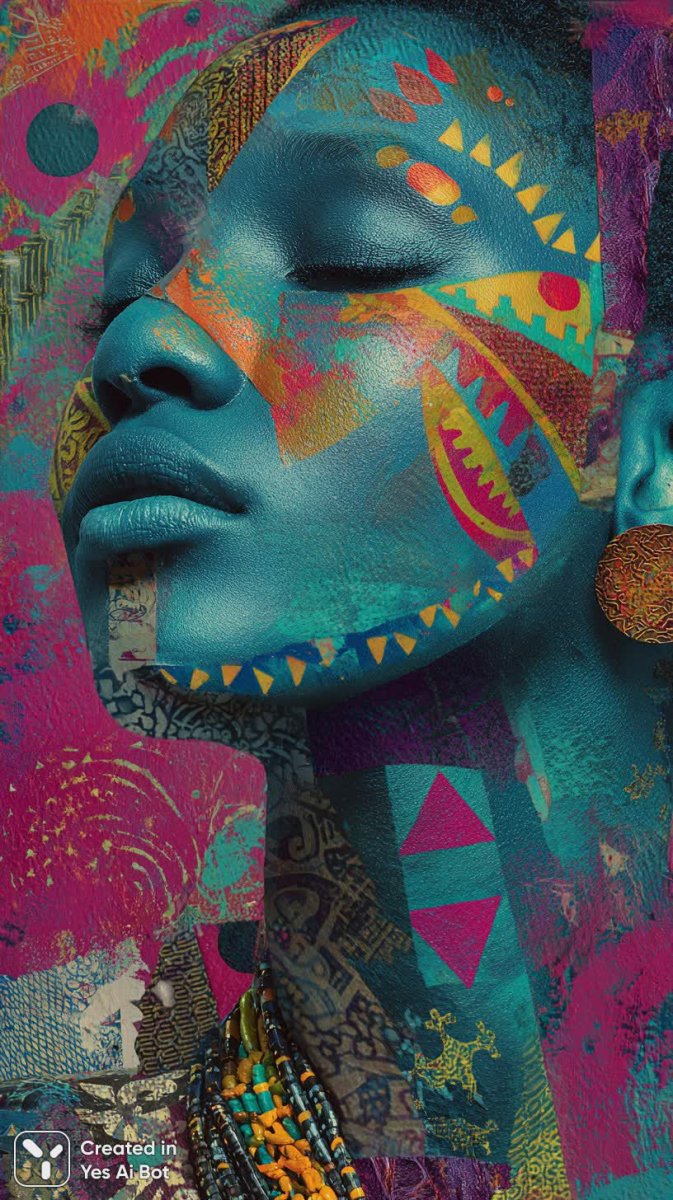 Яркий коллаж лица женщины, обращенного вправо, с закрытыми глазами и слегка приоткрытыми губами, украшенного красочными племенными узорами на щеках. Фон представляет собой вихревое сочетание бирюзового и пурпурного цветов, акцентированное абстрактными формами, создавая динамичную и живую атмосферу. В этом визуальном произведении ощущается сила и культурное богатство, передающее глубокую связь с традициями и самобытностью. Это не просто изображение, а скорее символ внутренней гармонии и уверенности в себе, воплощенный в смелых цветах и графических элементах. Каждая деталь коллажа, от тонких линий узоров до интенсивных оттенков фона, работает вместе, чтобы создать захватывающее впечатление, которое заставляет зрителя задуматься о многогранности человеческой природы и красоте культурного наследия. В работе чувствуется дух свободы самовыражения и уважение к древним обычаям, что делает ее уникальным произведением искусства, наполненным глубоким смыслом и визуальной энергией. Это визуальная ода женственности, силе и красоте культурного разнообразия, запечатленная в ярком и динамичном коллаже. Изображение излучает позитивную энергию и вдохновляет на поиск собственной идентичности и признание ценности каждого человека