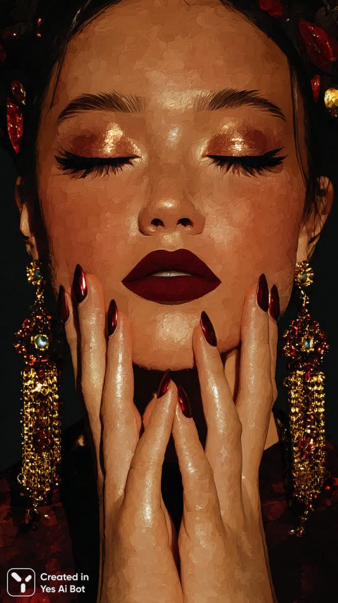 female face with dramatic makeup featuring bold lashes, deep red lips, golden accessories, intricate earrings, long metallic nails, soft glowing background, glamor style, studio shot, high-definition detail.
