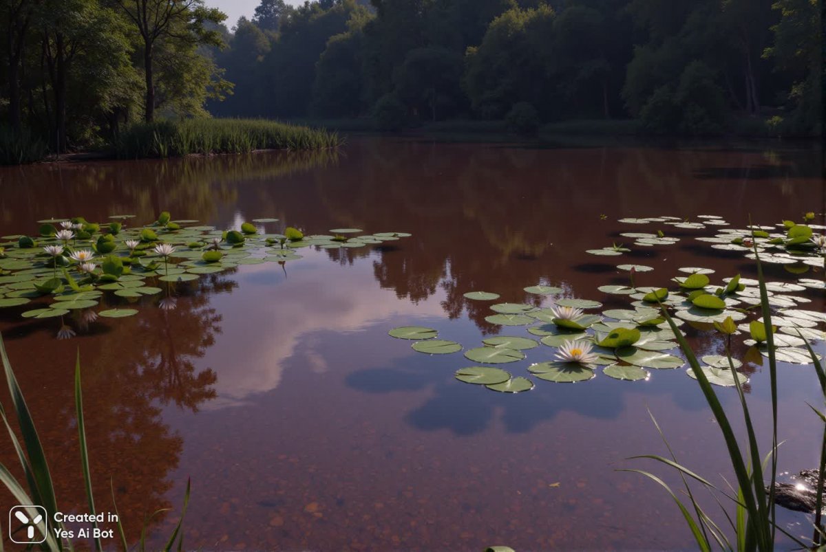 Безмятежный пейзаж пруда в стиле импрессионизма, излучающий спокойствие и умиротворение. Спокойная водная гладь, окрашенная в глубокие красно-коричневые тона, отражает небесную лазурь и густую зелень окружающего леса, создавая ощущение безграничного простора и гармонии с природой. Поверхность пруда усыпана яркими зелеными кувшинками, среди которых нежно белеют хрупкие водяные лилии – символ чистоты и невинности. На заднем плане возвышается густой лес, сотканный из темных оттенков зеленого и коричневого, добавляющий картине глубины и загадочности. По берегам пруда растут высокие камыши, слегка колышущиеся на ветру, придавая композиции динамику и живость. Мягкий, рассеянный свет создает атмосферу тепла и уюта, а отражение нежно-сиреневого неба в воде усиливает ощущение спокойствия и безмятежности. Манера письма характеризуется текстурными мазками, которые мастерски передают движение воды и ветра, придавая картине объемность и реалистичность. Картина пронизана атмосферой тишины и уединения, приглашая зрителя погрузиться в мир спокойствия и гармонии с природой, ощутить единение с окружающим миром и насладиться моментом безмятежного покоя. Это произведение искусства - ода красоте природы и ее способности дарить душевное равновесие и вдохновение. Кажется, будто время замерло в этом уголке дикой природы, позволяя забыть о суете повседневной жизни и просто наслаждаться моментом
