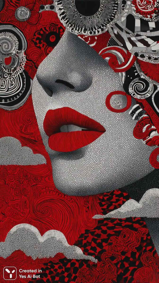Изысканный портрет прекрасной женщины, чье лицо завораживает своей детализированностью и выразительностью. Яркие алые губы – акцент, притягивающий взгляд, а изысканные украшения подчеркивают ее утонченный вкус и благородство. Фон картины представляет собой феерический пейзаж, выполненный в насыщенных красных тонах, где белоснежные облака словно парят над землей, а замысловатые растительные орнаменты добавляют картине нежности и гармонии. Черно-белые вихреобразные узоры, окружающие лицо модели, создают эффект драматизма, усиливая загадочность и притягательность образа. Композиция продумана до мельчайших деталей, каждый элемент сочетается с другим, образуя единое целое, наполненное красотой и гармонией. Это произведение искусства – воплощение элегантности, женственности и творческого гения художника, способного передать эмоции и чувства через игру света и тени, цвета и формы. Картина словно оживает на глазах, заставляя зрителя погрузиться в мир грез и фантазий. Она не просто изображение, а история, рассказанная языком живописи, полная таинственности, страсти и очарования. Вся картина излучает энергию, притягивая к себе внимание и оставляя неизгладимое впечатление