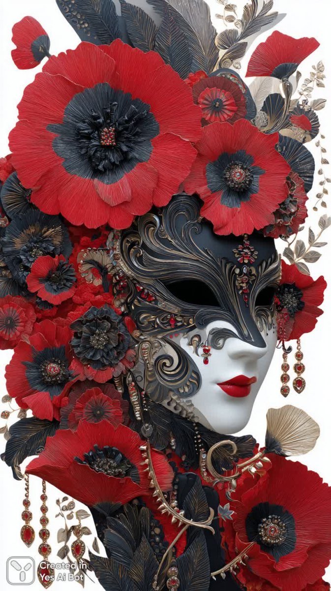 Эта маска представляет собой захватывающее произведение искусства, поражающее своей детализацией и выразительностью. Сложный узор из витиеватых спиралей создает ощущение движения и динамики, притягивая взгляд и погружая в мир фантазий. Крупные красные цветы, словно вспышки энергии, оживляют композицию, добавляя ей страсти и загадочности. Акценты из нежных драгоценных камней придают маске роскошь и утонченность, подчеркивая ее исключительную ценность. Контрастный фон в черно-белых тонах создает эффект гипноза, усиливая визуальное воздействие и добавляя глубины изображению. Каждое пятно цвета, каждая линия тщательно продумана, чтобы создать гармоничное и запоминающееся целое. Маска излучает мощную энергию и таинственность, словно хранит в себе древние секреты и тайные знания. Ее детализация настолько высока, что кажется, будто она оживет, если приглядеться внимательнее. Это не просто маска, а портал в другой мир, полный волшебства и чудес. Она способна очаровать любого зрителя своей красотой и загадочностью, вызывая восхищение и желание разгадать ее тайну. Каждая деталь, от изгиба лепестков до мерцания драгоценных камней, говорит о мастерстве художника и его стремлении к совершенству. Маска — это воплощение красоты, силы и загадки, способное пробудить самые потаенные уголки души