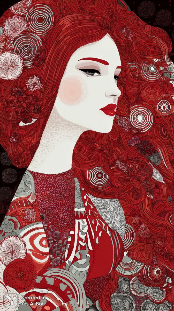 Изысканный портрет женщины, пленяющий своей детализацией и загадочной красотой. Ее волосы, словно живые волны, ниспадают мягкими локонами, сплетаясь в причудливые спиральные узоры, создающие ощущение движения и легкости. Яркий макияж с акцентом на смелые сочетания красного и белого цветов подчеркивает ее выразительные черты лица, придавая облику драматичность и элегантность. Композиция захватывает взгляд, благодаря продуманному расположению элементов и тщательно выписанному фону. За спиной модели простирается фантастический сад из замысловатых цветочных орнаментов и вихревых узоров, создающих атмосферу сказочности и волшебства. Кажется, будто женщина является частью этого причудливого мира, воплощением красоты и таинственности. Каждый штрих полон смысла, каждая деталь продумана до мелочей, что делает этот портрет настоящим произведением искусства. Взгляд модели, полный загадки и уверенности, заставляет задуматься о ее истории и внутреннем мире. Это не просто изображение, это погружение в мир фантазий и грез, где красота сочетается с элегантностью, а тайна – с очарованием. Портрет излучает энергию и силу, демонстрируя неповторимый стиль и изысканный вкус. Он станет украшением любой коллекции и подарит зрителям незабываемые впечатления от созерцания истинной красоты