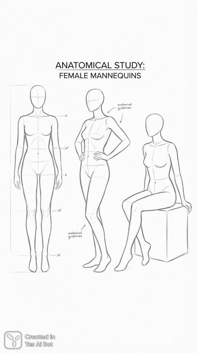 Изображение представляет собой минималистичный эскиз трех женских манекенов, выполненных в виде простых серых контурных линий. Отсутствие детализации и лиц подчеркивает акцент на изучении анатомических форм и пропорций. Стиль рисунка лаконичен и чист, сфокусирован на передаче базовой структуры тела без излишних украшений или декоративных элементов. Белый фон служит нейтральным фоном, который позволяет выделить силуэты манекенов и подчеркнуть их графическую простоту. Манекены изображены в разных позах, что указывает на цель иллюстрации – демонстрацию разнообразия человеческой фигуры и ее возможностей движения. В целом, работа выполнена в духе минимализма и представляет собой скорее анатомическое исследование, чем художественное произведение в традиционном смысле. Простота линий и отсутствие второстепенных деталей создают ощущение чистоты и ясности, позволяя зрителю сосредоточиться на основных формах и пропорциях человеческого тела. Такой подход идеально подходит для учебных материалов или визуальных пособий, где важна четкость и понятность представления анатомических данных. Использование серого цвета придает изображению сдержанность и элегантность, а чистый белый фон обеспечивает максимальную читаемость и восприятие формы