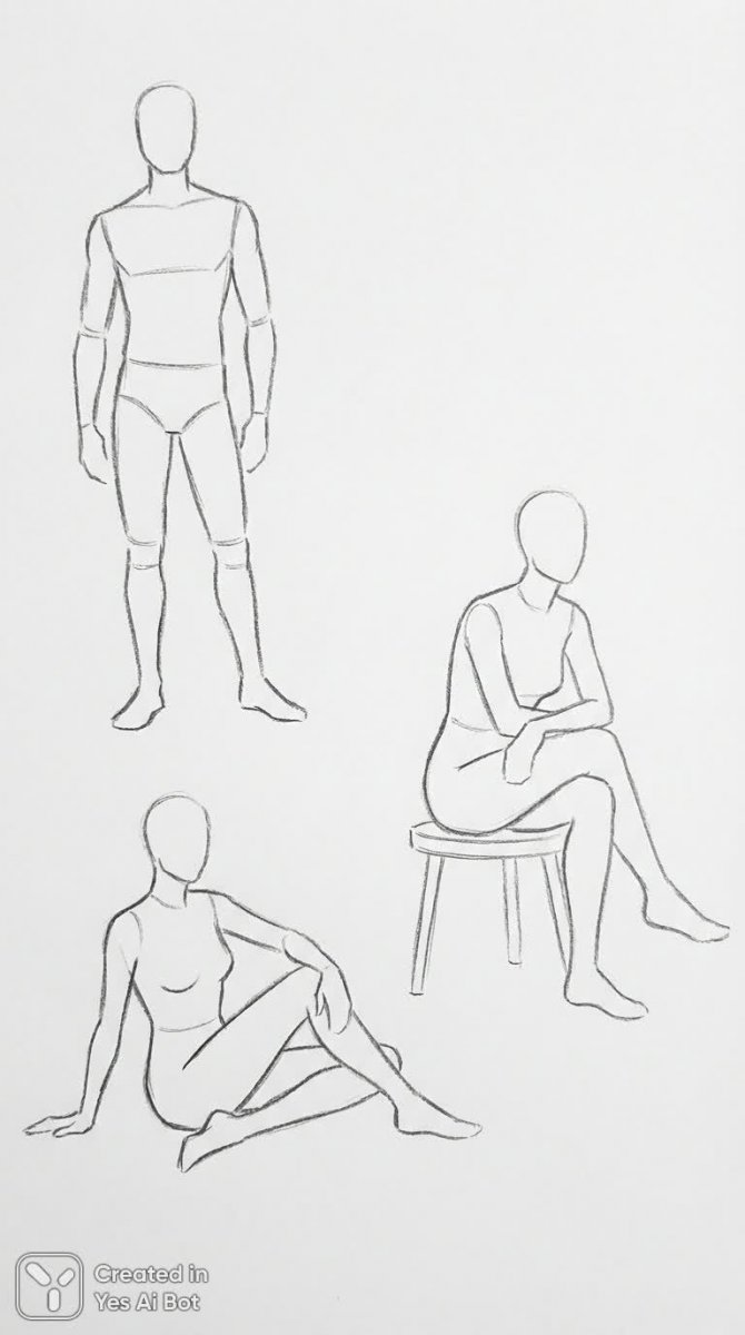 stylized gray figure sketches, simplistic outlines of mannequins, no faces, different poses — one standing, two sitting, minimalistic composition, clear lines, white BG.