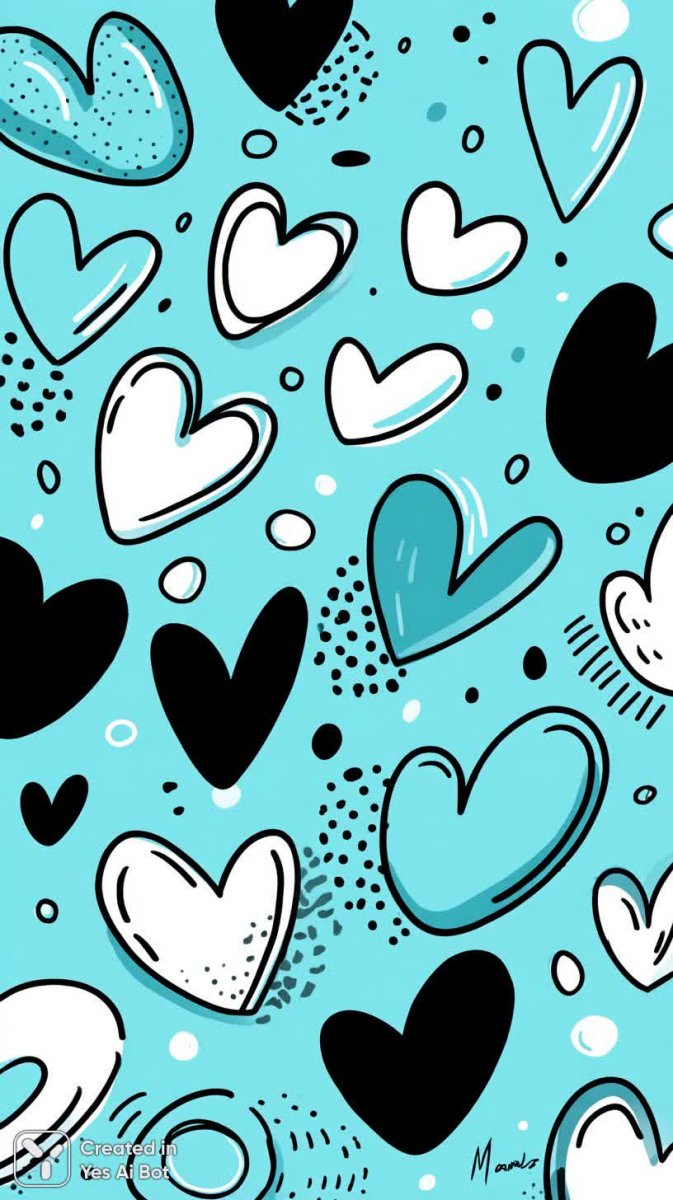 bright abstract background, turquoise hearts, simple shapes, geometric patterns, black outlines, minimalist illustration, playful mood, pop art style, cheerful composition, ink drawing.