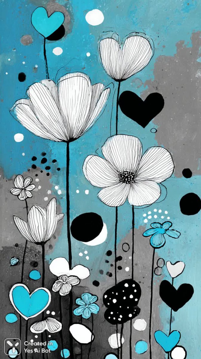 black outlines, bright abstract background, large white flowers, turquoise hearts, polka dots and circles, cheerful and vibrant composition, sketch style, modern motifs, minimalism, playful joy.
